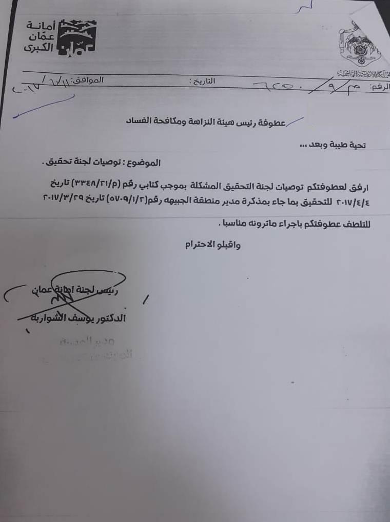 وبين شموط أنه بعد استكمال التحقيقات من اللجنة مع الموظفين المعنيين بالقضية تم اثبات مبدئي بوجود حالة غير صحيحة وإجراءات مثيرة للشبهة ، مما استدعى لجنة تحقيق الامانة وبموافقة امين عمان لتحويل القضية برمتها الى هيئة النزاهة ومكافحة الفساد بتاريخ 11/7/2017 ولوجود أطراف من خارج كوادر الامانة مستفيده من هذه الكتب غير الصحيحة.