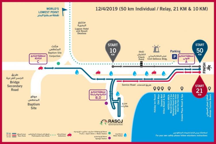 البداية مقابل شاطئ عمان السياحي بالبحر الميت، والجري صعوداً بشارع الخدمات (بعكس إتجاه حركة السير) وصولاً إلى الشارع المؤدي إلى منطقة السكاي دايف، ثم الإلتفاف والعودة إلى شارع الخدمات مرة أخرى بإتجاه شاطئ عمان السياحي (خط النهاية).سباق ال 10 كموقت ا لإنطلاق في تمام الساعة 9:00 صباحاً. البداية بعد 2 كم من مثلث المغطس والجري نزولاً إلى منطقة الفنادق (بإتجاه حركة السير) وصولاً إلى شاطئ عمان السياحي (خط النهاية).