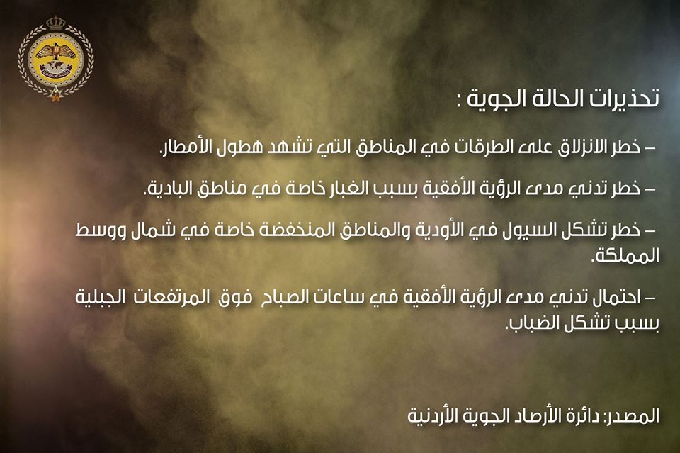 وكالة الناس – نشر المركز الوطني للأمن وإدارة الازمات تحذيرات للمواطنين حول الحالة الجوية للأيام الثلاثة القادمة.