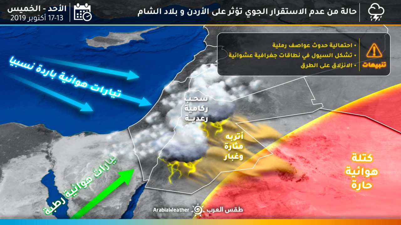 استمرار فرصة هطول الأمطار والغبار مع ساعات الليل، يُتوقع أن يكون الطقس أكثر حرارة من من المعتاد وغير مستقر فوق أجزاء مُختلفة من المملكة، مع ازدياد نسب الغبار في الأجواء، و يستمر ظهور كميات من السحب على ارتفاعات مُختلفة، ولا يُستبعد هطول زخات رعدية من الأمطار، بمشيئة الله، في أجزاء متفرقة وعشوائية من المملكة فيها مدينة العقبة، قد تكون غزيرة أحياناً في بعض النطاقات الجغرافية الضيقة.