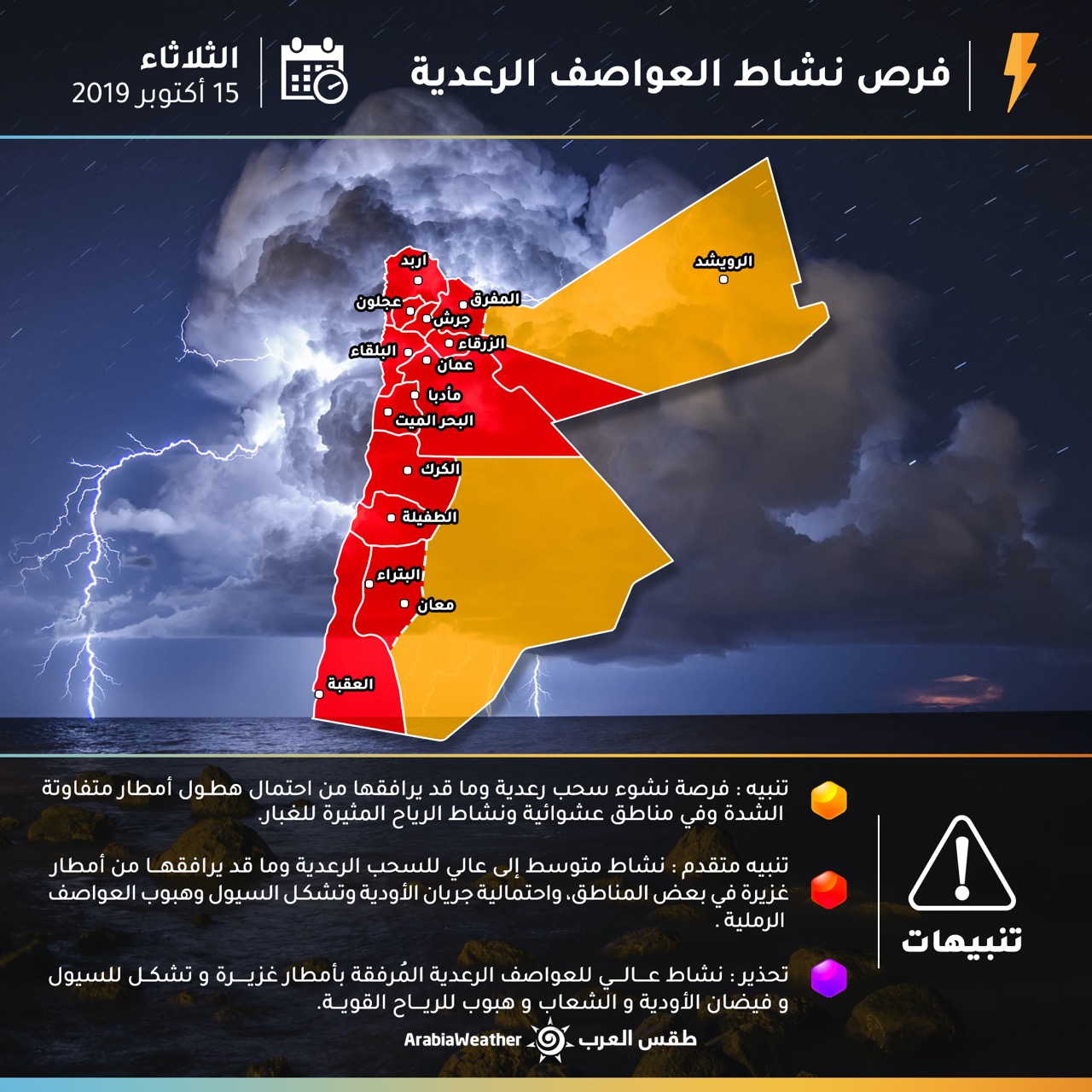 وتُسبق هذه الأمطار بنشاط كبير للرياح السطحية التي يُتوقع أن تتسبب بحدوث عواصف رملية محلية الطابع و تحد من مدى الرؤية الأفقية، مع ساعات ليل الثلاثاء/ الاربعاء، استمرار الأجواء غير المستقرة وفرصة الامطار الرعدية.