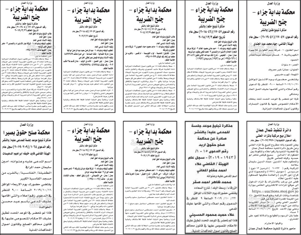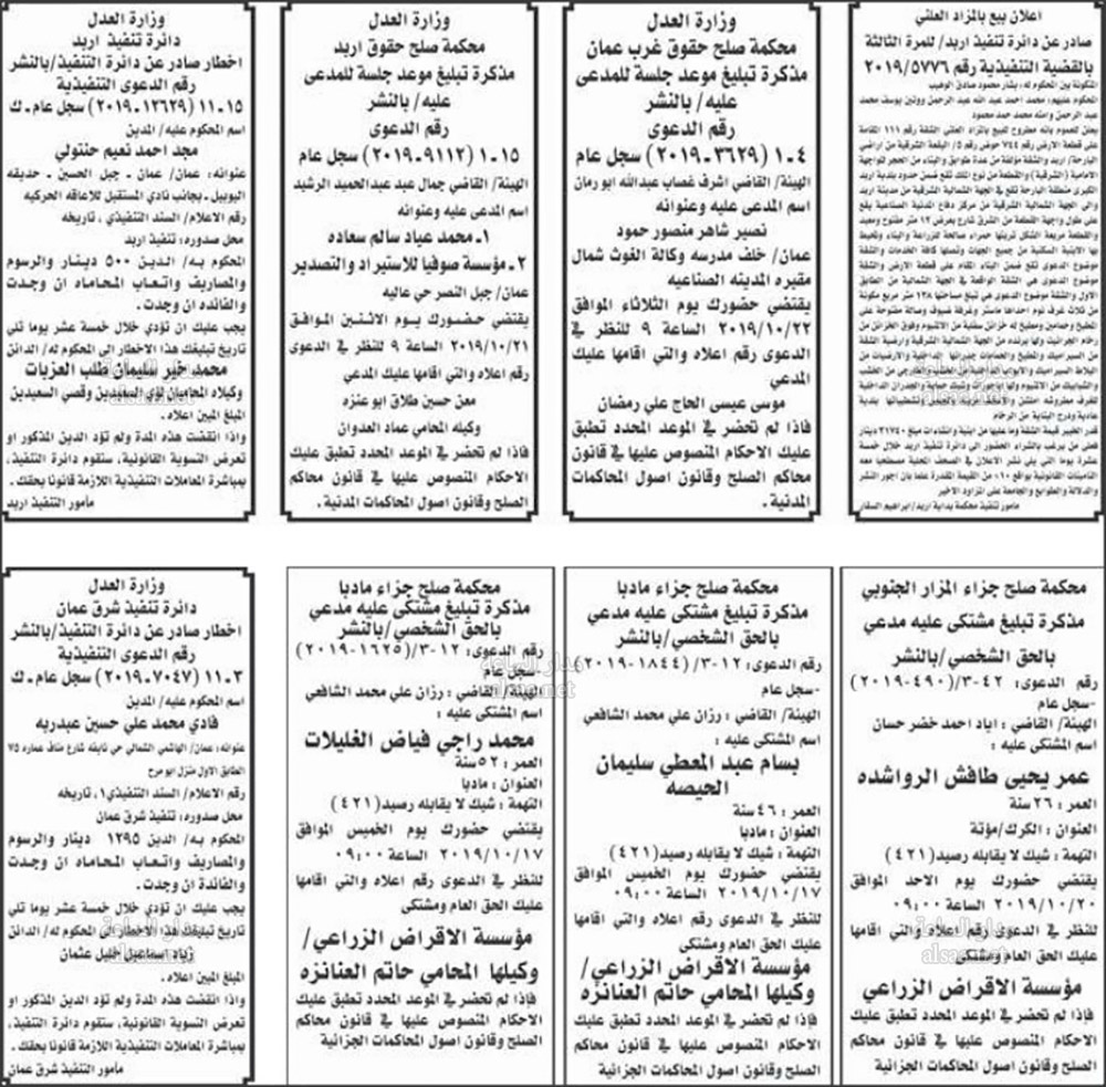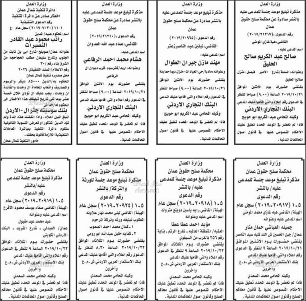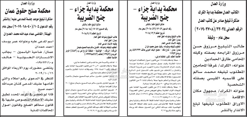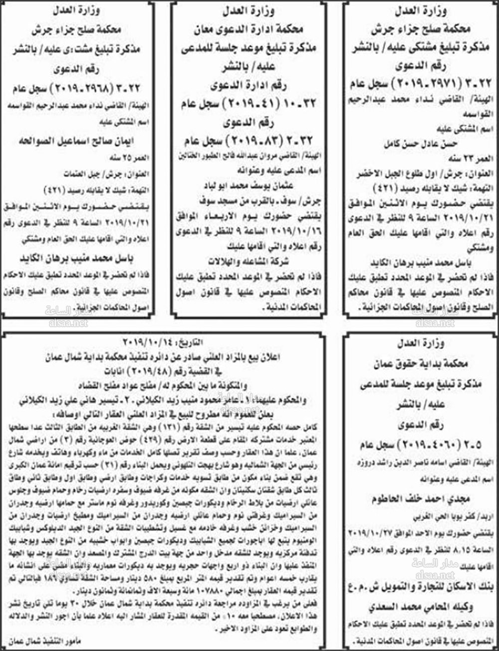 وكالة الناس – أعلنت محاكم اليوم الثلاثاء 15 / 10 /2019.. عن مذكرات تبليغ مواعيد جلسات المحاكمة للمشتكى عليهم المذكورين في الجدول ادناه.