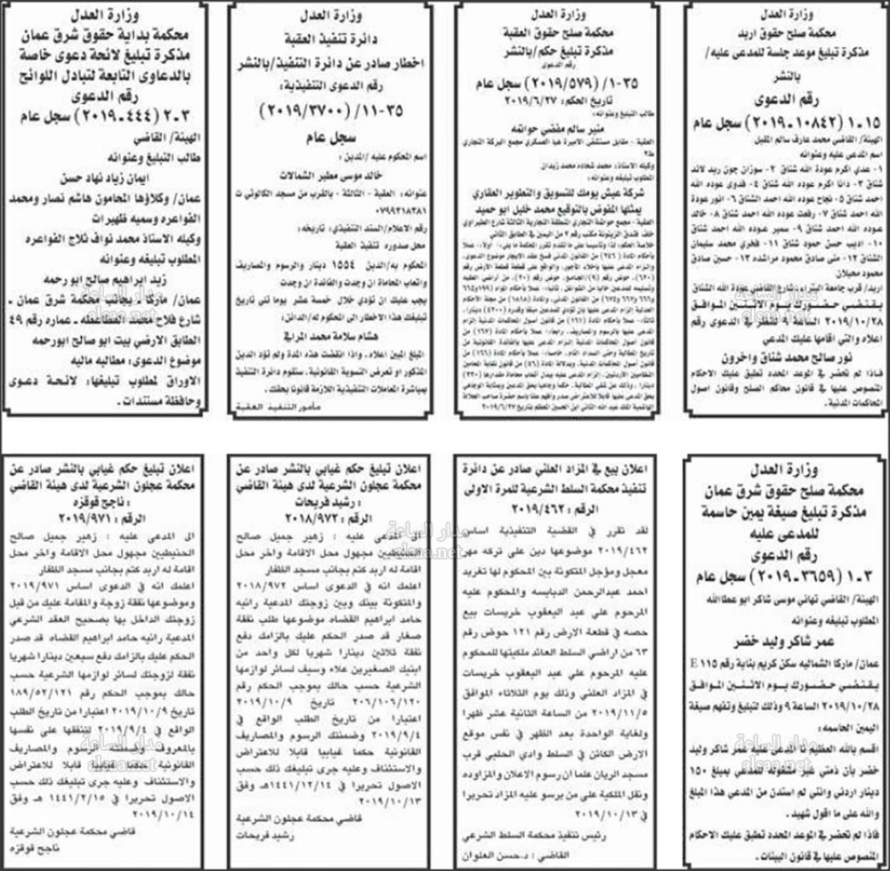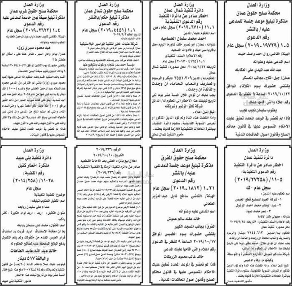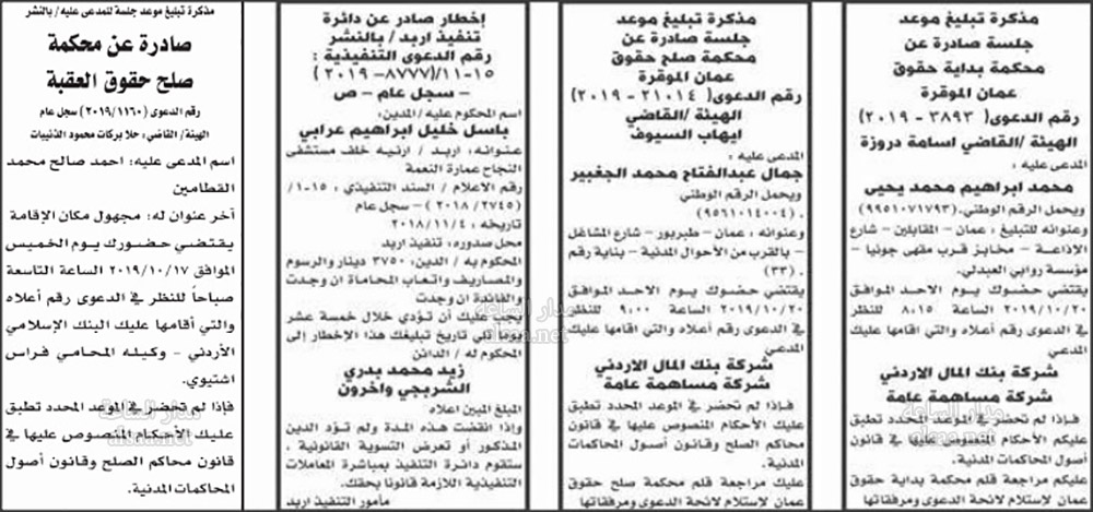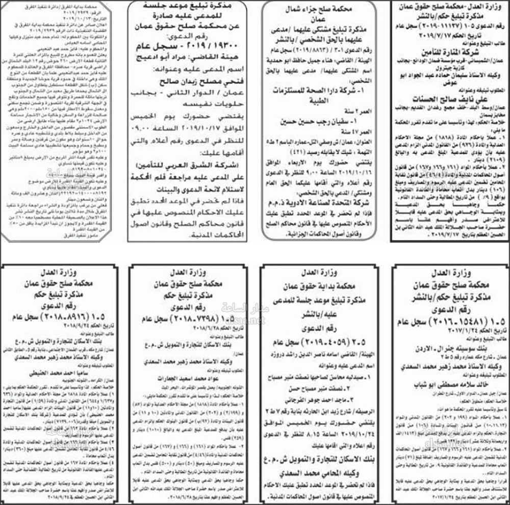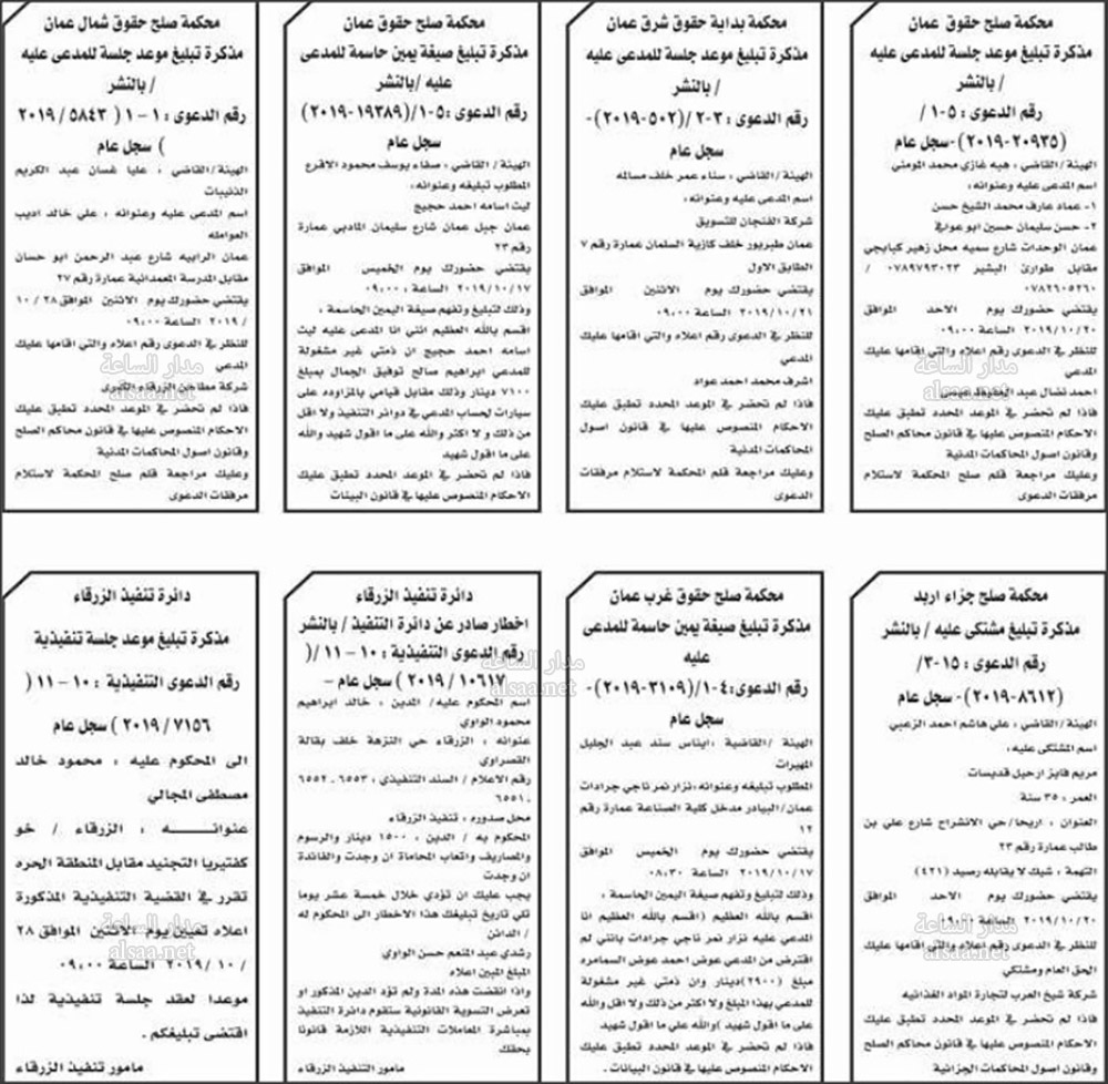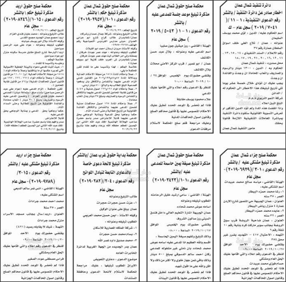 وكالة الناس – أعلنت محاكم اليوم الثلاثاء 15 / 10 /2019.. عن مذكرات تبليغ مواعيد جلسات المحاكمة للمشتكى عليهم المذكورين في الجدول ادناه.
