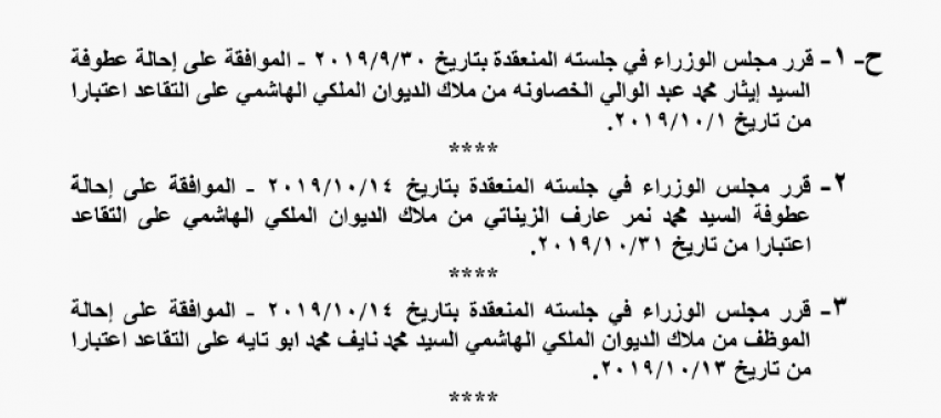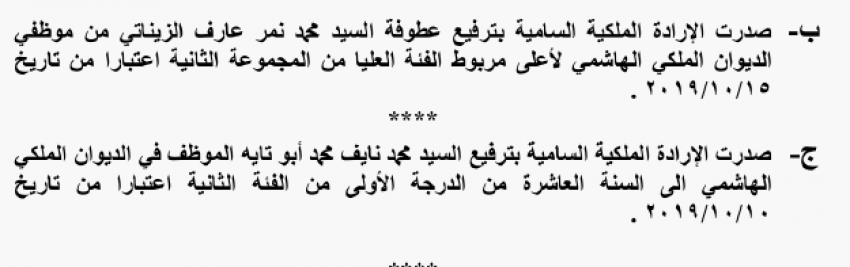 بالاسماء .. ترفيعات وإحالات الى التقاعد في الديوان الملكي Last updated أكتوبر 16, 2019 Share وكالة الناس – صدرت الإرادة الملكية السامية بترفيع عدد من موظفي الديوان الملكي، وقبول استقالة آخرين. وتاليا الاسماء: