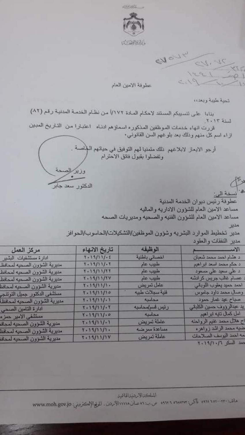 بالأسماء .. انهاء خدمات 12 موظفاً في الصحة Last updated أكتوبر 17, 2019 Share وكالة الناس – قرر وزير الصحة الدكتور سعد جابر انهاء خدمات 12 موظفا بينهم 4 اطباء لبلوغهم السن القانوني على النحو التالي: