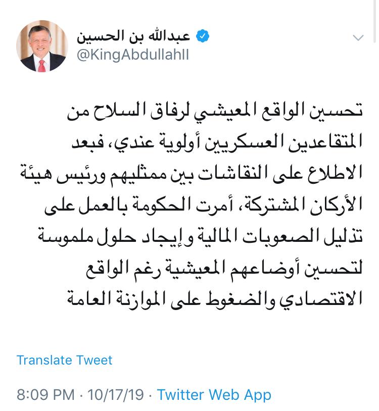 وكالة الناس – أكد جلالة الملك عبدالله الثاني أن تحسين الواقع المعيشي لرفاق السلاح من المتقاعدين العسكريين أولوية لديه، وأضاف جلالته عبر تغريده له :” أنه أمرالحكومة بالعمل على تذليل الصعوبات المالية وإيجاد حلول ملموسة لتحسين أوضاعهم المعيشية رغم الواقع الاقتصادي والضغوط على الموازنة العامة.