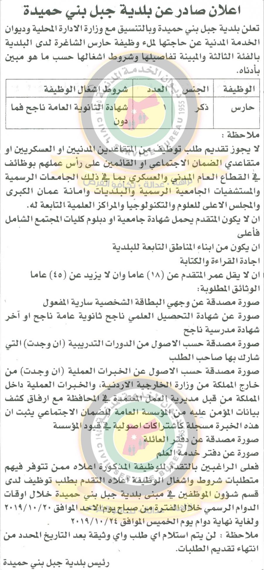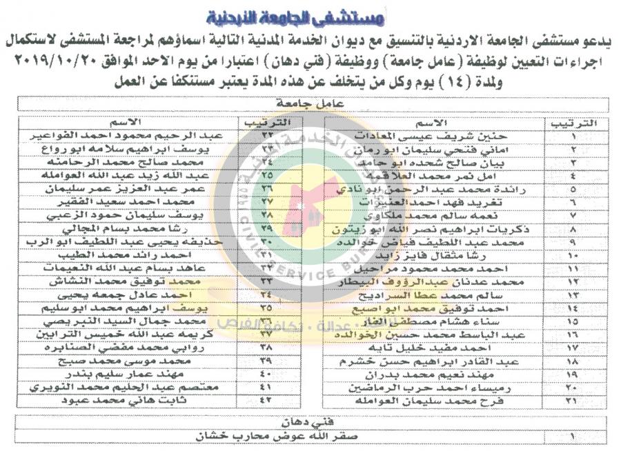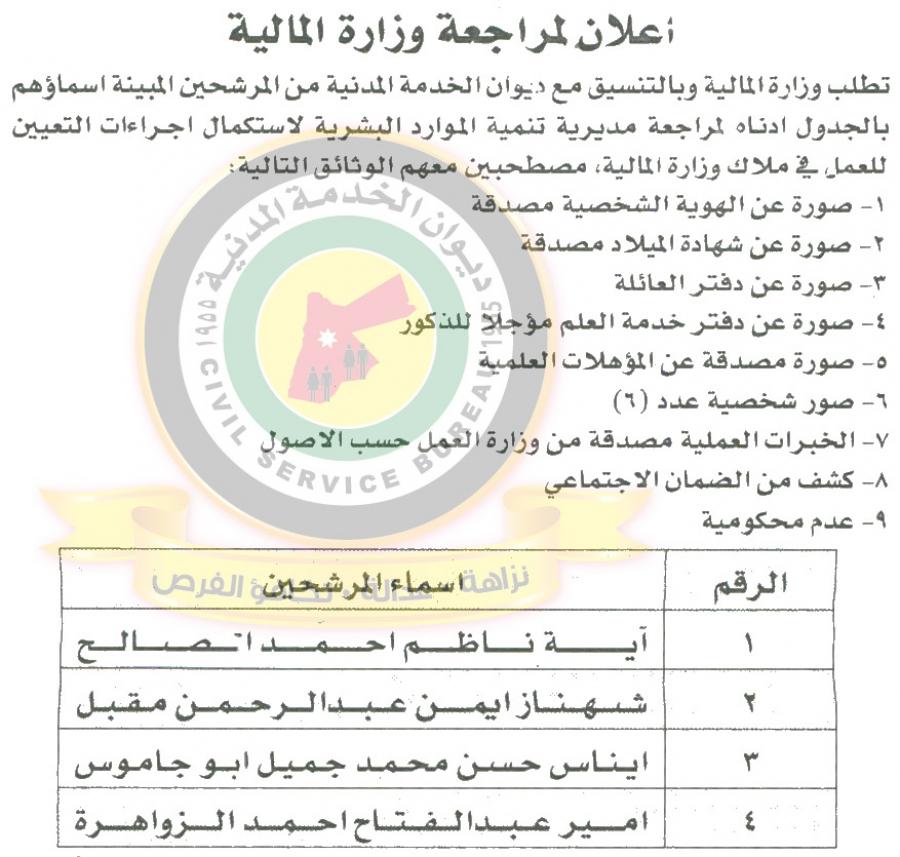 وكالة الناس – دعا ديوان الخدمة المدنية بالتعاون مع مختلف الوزارات والمؤسسات الحكومية، التالية اسماؤهم لاجراء المقابلات الشخصية وعقد الامتحان التنافسي لغايات التعيين، كما دعا الديوان بالتنسيق مع مختلف المؤسسات والوزارات إلى تعبئة شواغر مختلفة استنادا للشروط المنصوص عليها من كل مؤسسة.