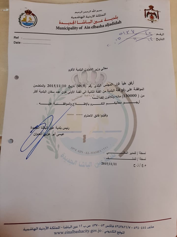 فقد اتخذت بلدية عين الباشا قرارها بترفيع بلدية عين الباشا من الفئة الثانية الى الفئة الاولى تحت رقم ( 8 / 46 ) تاريخ 10/11/2015 كون عدد سكان بلدية عين الباشا تجاوز ال (130 ) الف نسمه وبحضور رئيس البلدية وجميع الاعضاء .
