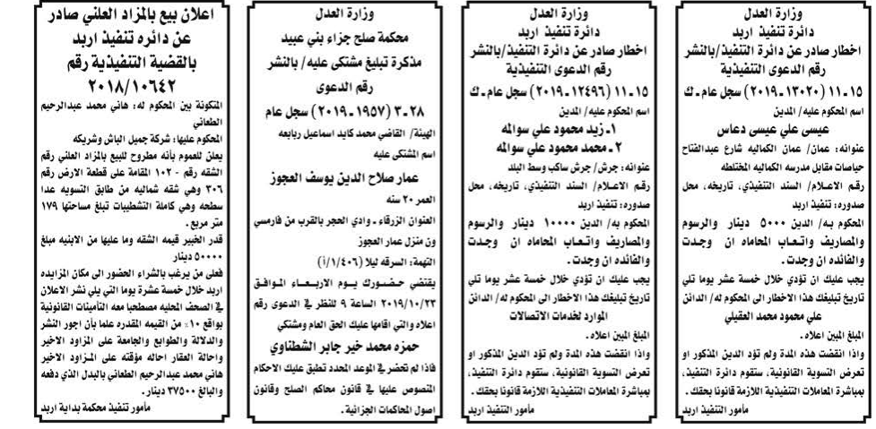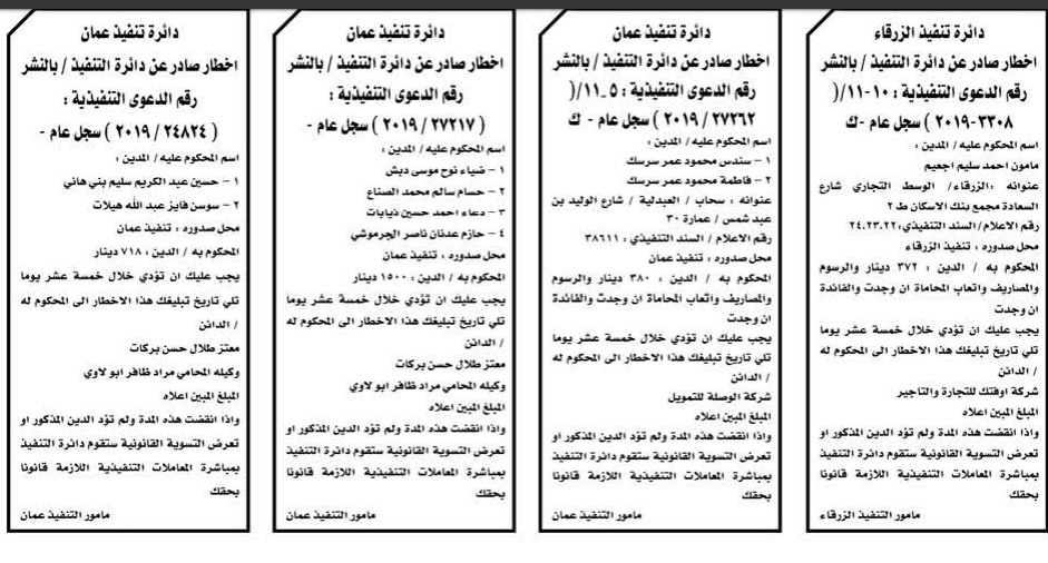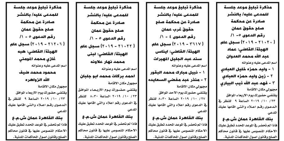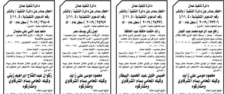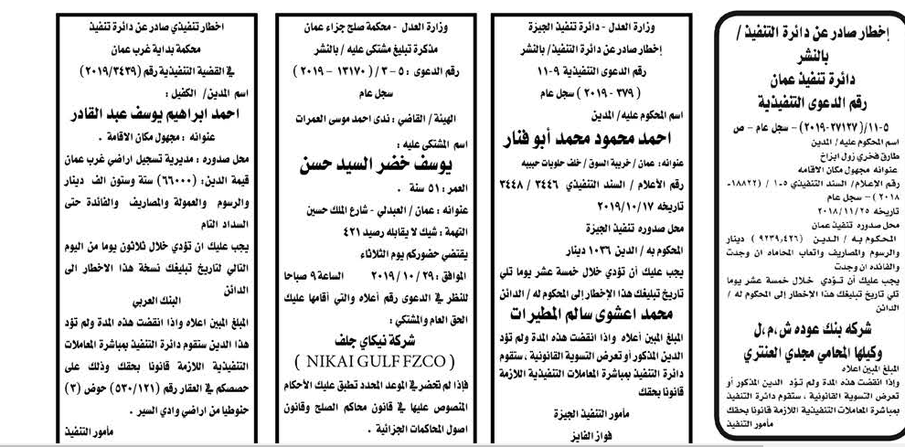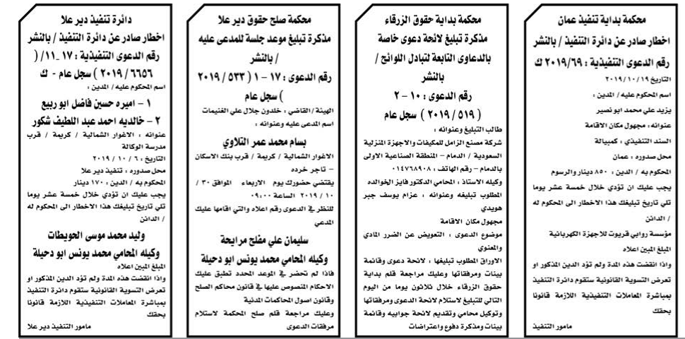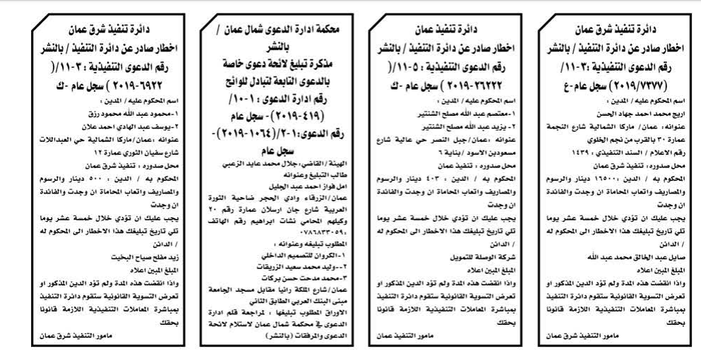 وتضمنت مذكرات الطلب التي تنشرها سرايا بعض الاحكام الصادرة غيابياً إضافة إلى إخطارات وإشعارات صادرة عن دوائر التنفيذ بحق مدعى عليهم أشخاص كانوا أم شركات.