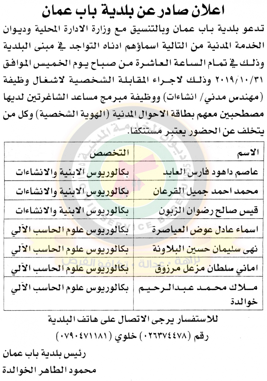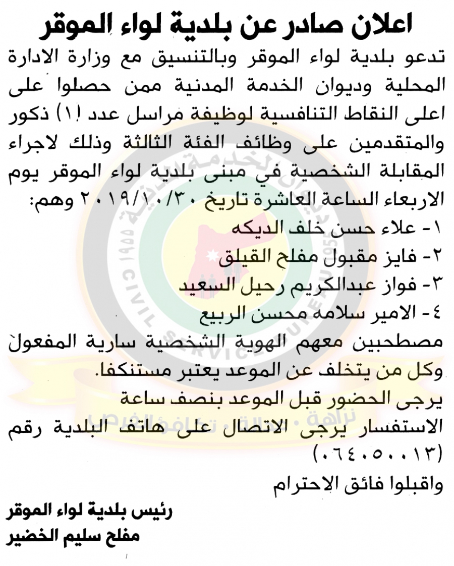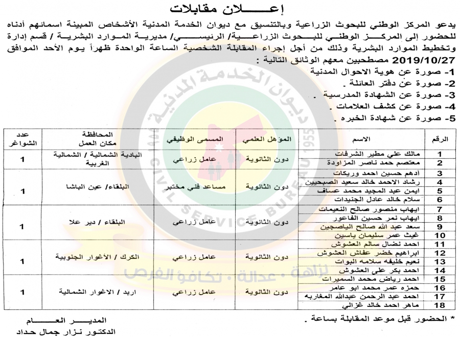 وكالة الناس – دعا ديوان الخدمة المدنية بالتعاون مع مختلف الوزارات والمؤسسات الحكومية، التالية اسماؤهم لاجراء المقابلات الشخصية وعقد الامتحان التنافسي لغايات التعيين.
