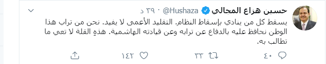وكتب المجالي عبر حسابه على “تويتر”: يسقط كل من ينادي بإسقاط النظام. التقليد الأعمى لا يفيد. نحن من تراب هذا الوطن نحافظ عليه بالدفاع عن ترابه وعن قيادته الهاشمية. هذهِ القلة لا تعي ما تطالب به.