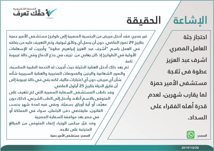 وكالة الناس – “حقك تعرف” تنفي احتجاز جثة عامل مصري لمدة شهرين في ثلاجة مستشفى حمزة.