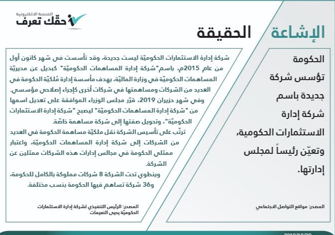 نشرت منصة حقك تعرف الحكومية، توضحيا حول ما يشاع، على مواقع التواصل الاجتماعي، بخصوص قيام الحكومة بتأسيس شركة جديدة باسم شركة إدارة الاستثمارات الحكومية، وتعيّن رئيساً لمجلس إدارتها.