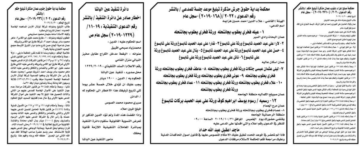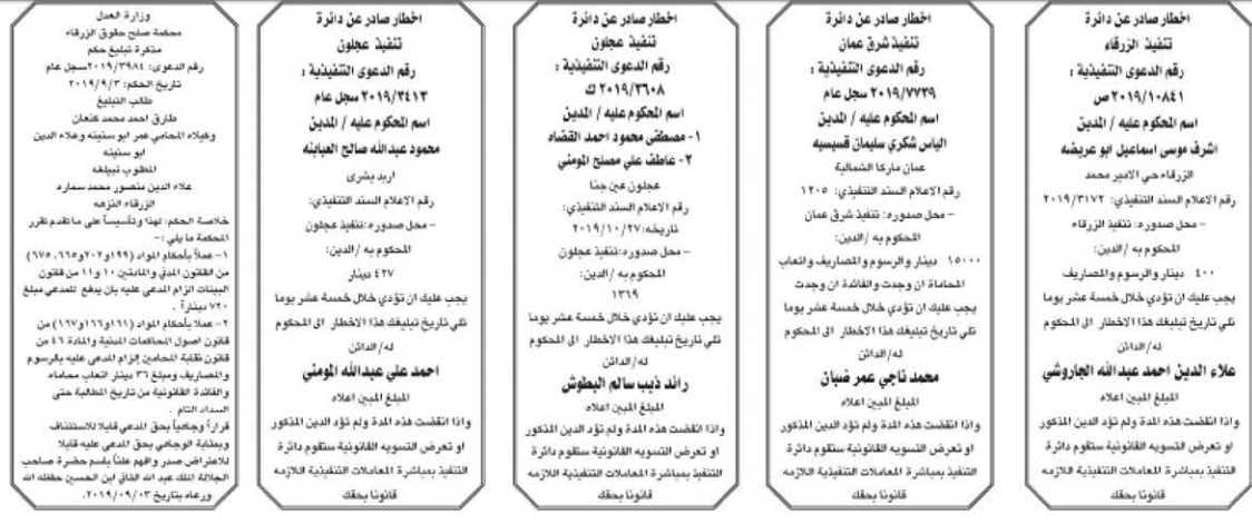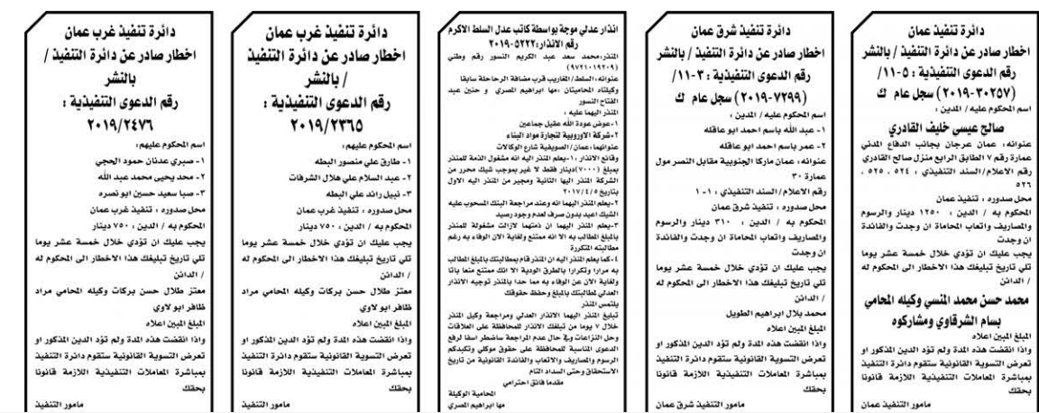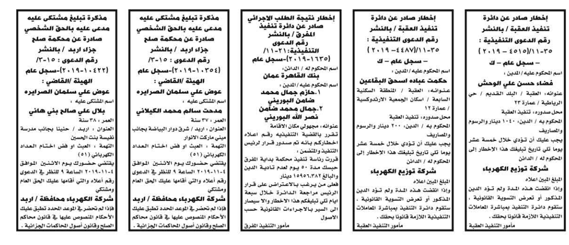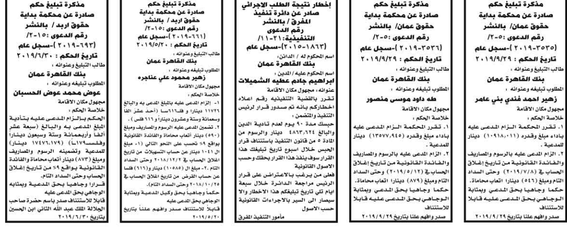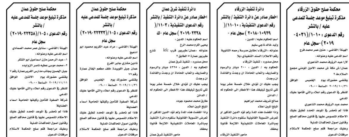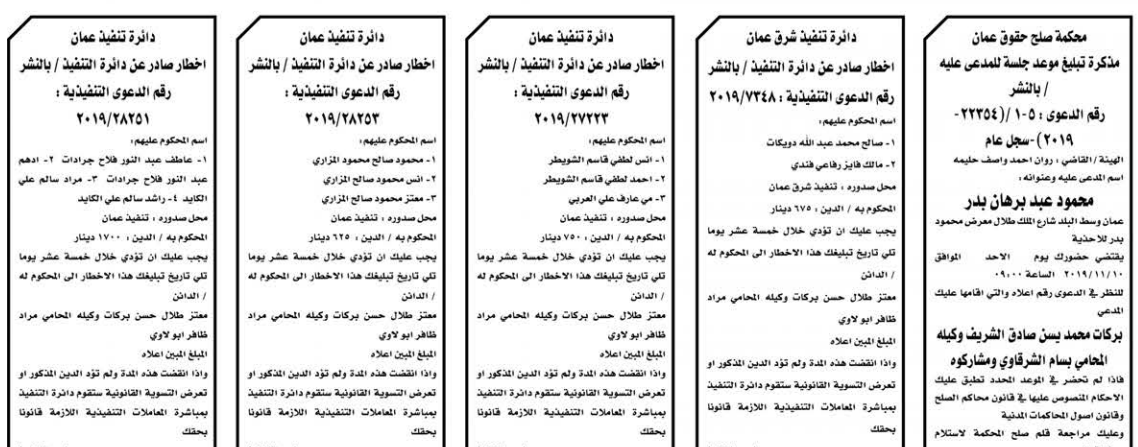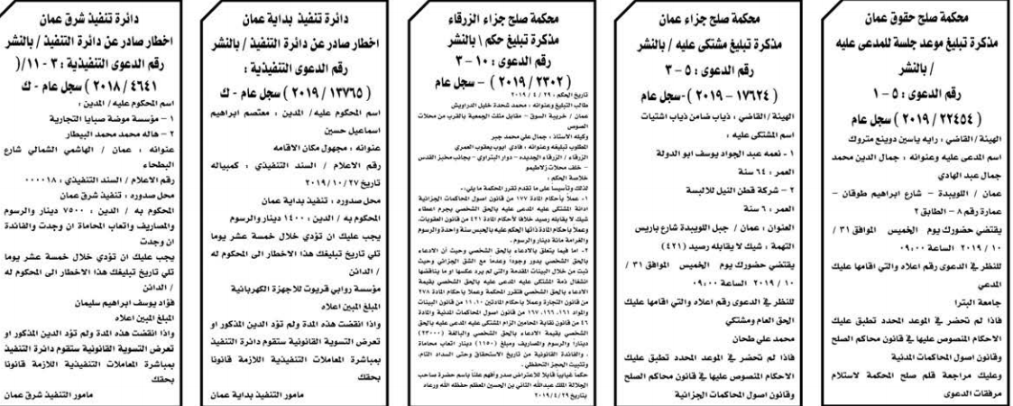 وتضمنت مذكرات الطلب التي تنشرها سرايا بعض الاحكام الصادرة غيابياً إضافة إلى إخطارات وإشعارات صادرة عن دوائر التنفيذ بحق مدعى عليهم أشخاص كانوا أم شركات.