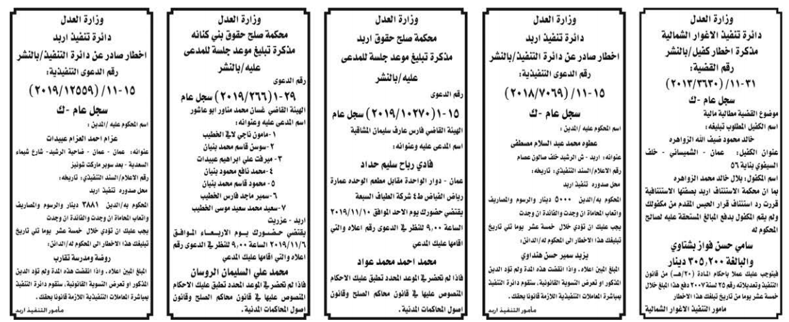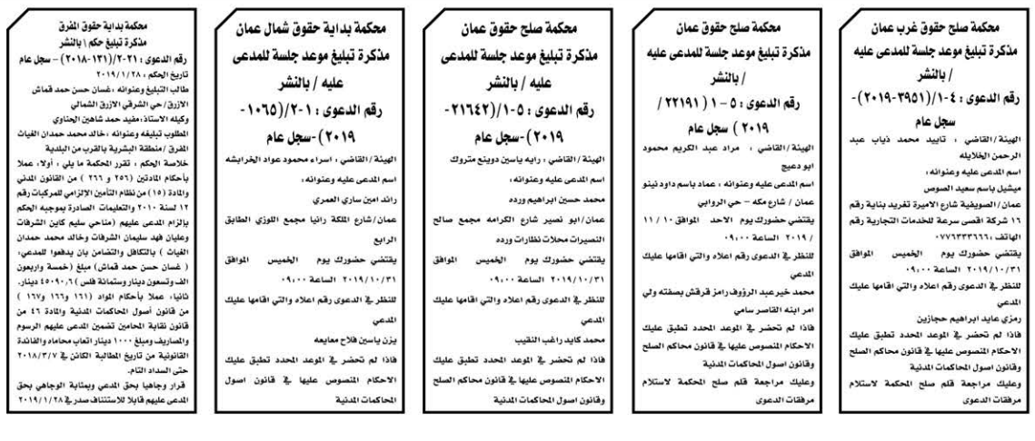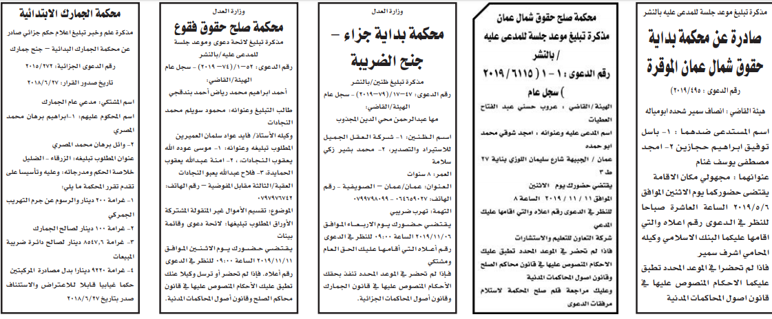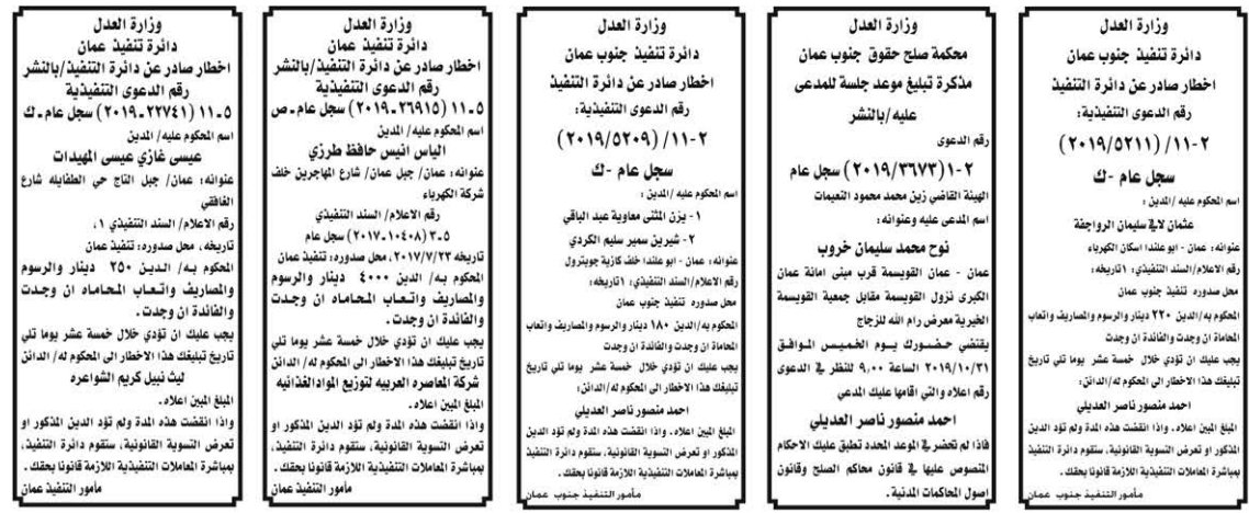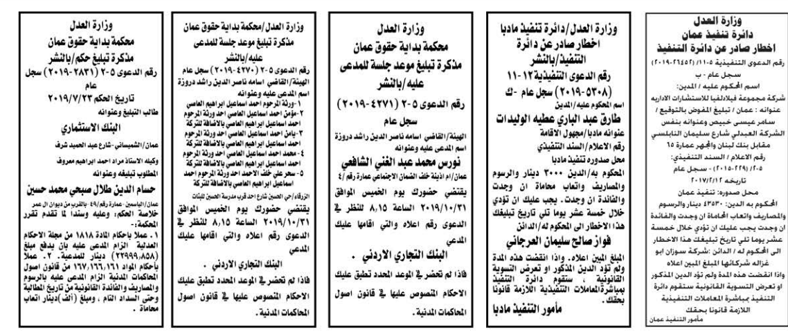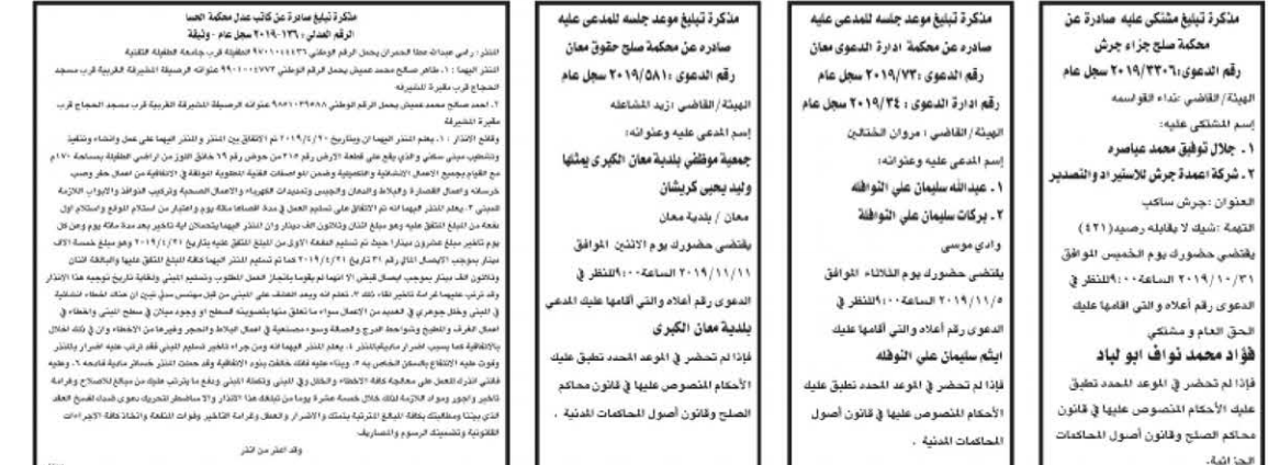 وكالة الناس – أعلنت وزارة العدل اليوم عن مذكرات تبليغ مواعيد جلسات المحاكمة للمدعى عليهم بقضايا مختلفة عن طريق المحاكم.