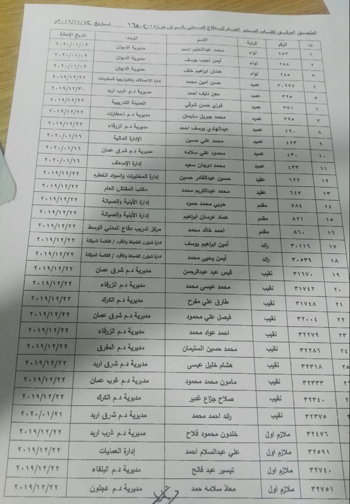بالاسماء…احالات على الاستيداع في الدفاع المدني Last updated نوفمبر 12, 2019 Share وكالة الناس – قرر مجلس الوزراء في جلسته المنعقده بتاريخ 18/9/2019 ، احالة الضباط المذكورين ادناه على الاستيداع اعتبارا من 1/12/2019 ولحين اكمالهم المدة المقررة للتقاعد :