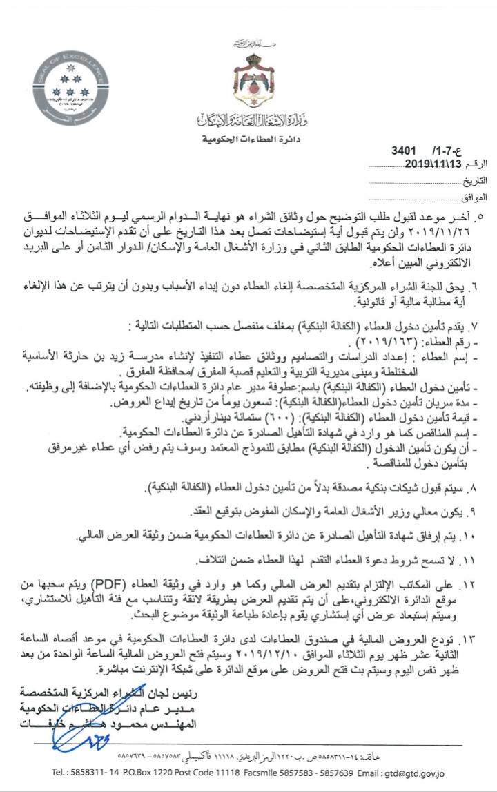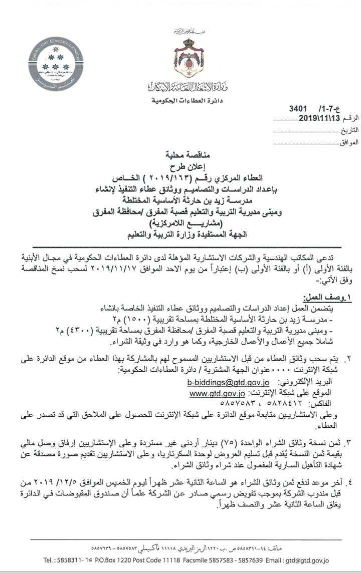 بالوثائق .. عطاء دراسات مبنى مديرية تربية قصبة المفرق ومدرسة زيد بن حارثة