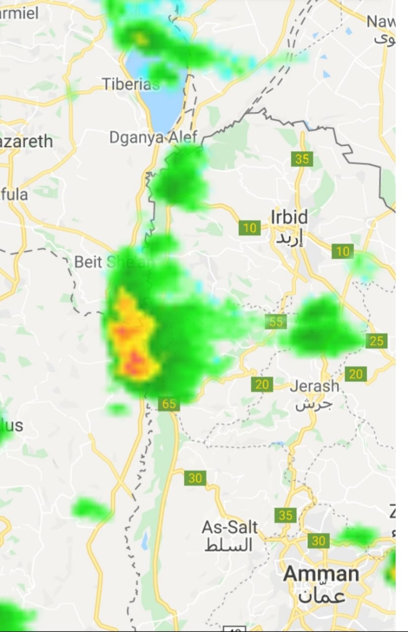 كما تشير صور الأقمار الاصطناعية إلى ظهور كميات من السحب الرعدية القوية على أجزاء من مناطق الأغوار الشمالية، ولذلك يحذر طقس العرب من السيول في تلك المناطق خلال الساعات القليلة القادمة.