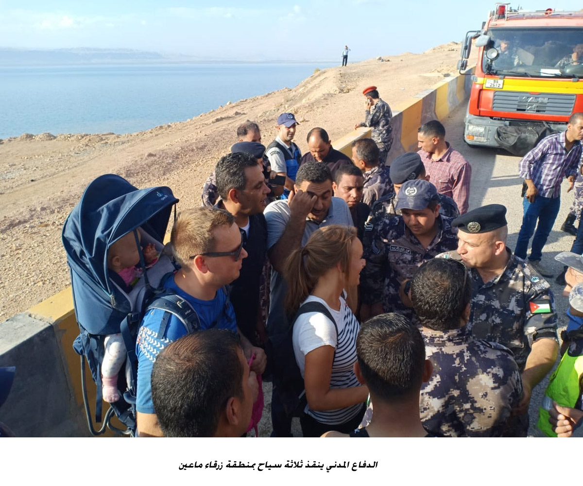 الدفاع المدني ينقذ ثلاثة سياح بمنطقة زرقاء ماعين