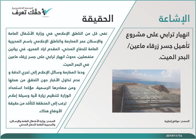 الإشاعة: إنهيار ترابي على مشروع جسر زرقاء ماعين/ البحر الميت