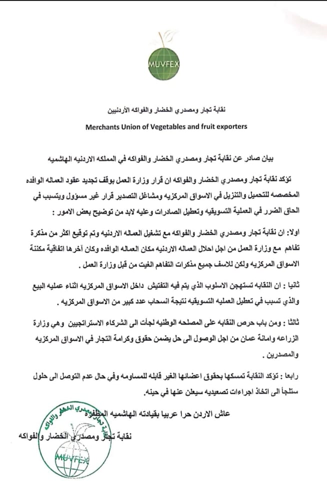 بيان صادر عن نقابة تجار ومصدري الفواكة في المملكة الاردنية الهاشمية