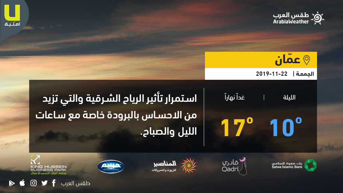 السبت .. أجواء مائلة للبرودة بمعظم المناطق Last updated نوفمبر 22, 2019 Share وكالة الناس – تميل الحرارة الى الانخفاض قليلاً مع بقائها قريبة من معدلها العام، وتسود أجواء مائلة للبرودة في مختلف المناطق، ومعتدلة في الأغوار والبحر الميت والعقبة، مع ظُهور كميات من السحب العالية.