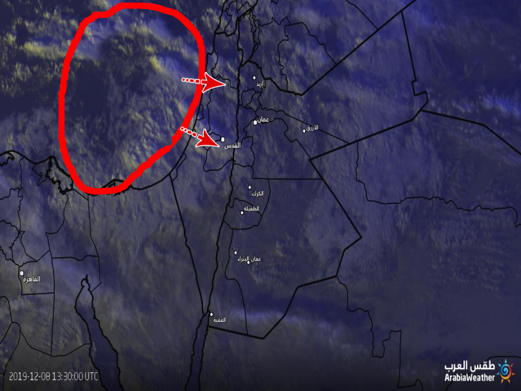 تشير صور الاقمار الاصطناعية إلى اندفاع كميات من السحب قادمة من البحر المتوسط، محملة بكميات من الأمطار خلال الساعة المقبلة، يشار الى ان الممكلة تتأثر منذ صباح اليوم الأحد بمنخفض جوي من الدرجة الثانية (الدرجة الاعتيادية) ضمن تصنيف طقس العرب للمنخفضات الجوية.