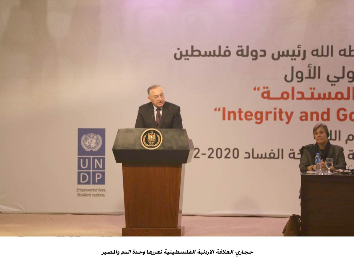 واضاف حجازي في حفل افتتاح المؤتمر الدولي الاول الذي نظمته هيئة مكافحة الفساد الفلسطينية وبدأ أعماله في رام الله امس الاثنين بمشاركة عربية ودولية، “كلنا يعرف ويتابع الجهود الحثيثة لجلالة الملك عبدالله الثاني لإرساء قواعد السلام في المنطقة وتحقيق اماني الشعب الفلسطيني الشقيق في اقامة دولته المستقلة على ارض وطنه وعاصمتها القدس الشريف وتوجيهات جلالته المستمرة بهذا الخصوص”.