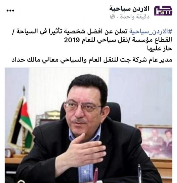 وكالة الناس – برز مدير عام شركة جت للنقل العام والسياحي معالي مالك حداد كأفضل شخصية سياحية لعام 2019 وفقاً لما اعلنه ” الاردن سياحة” من خلال تحليلاتها ودراساتها للقطاع السياحي خلال العام
