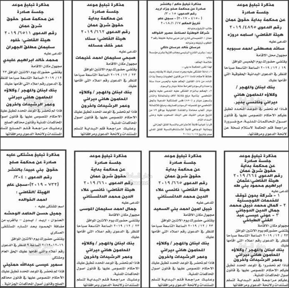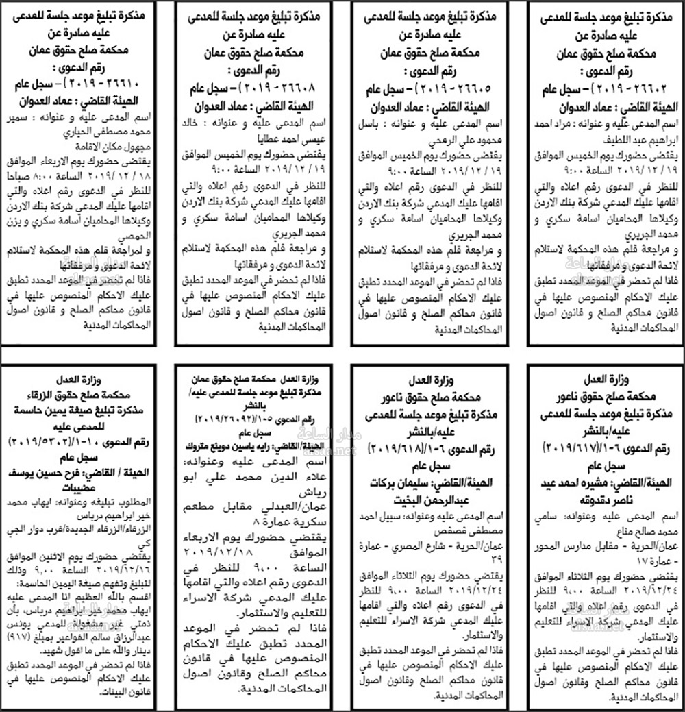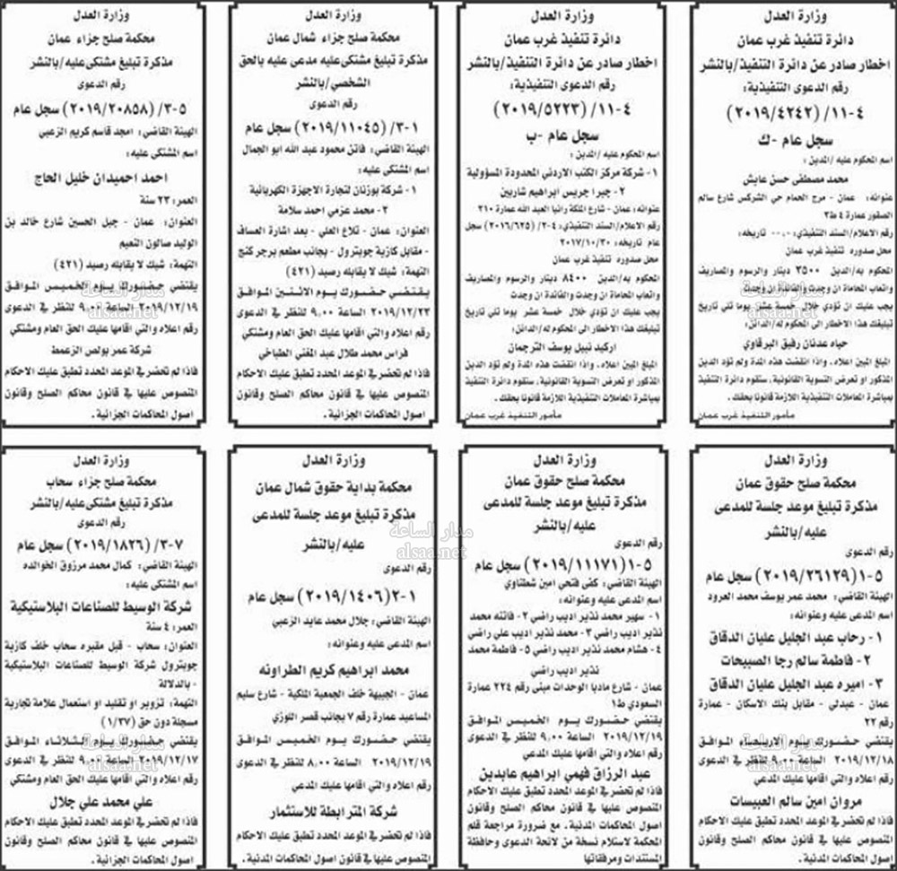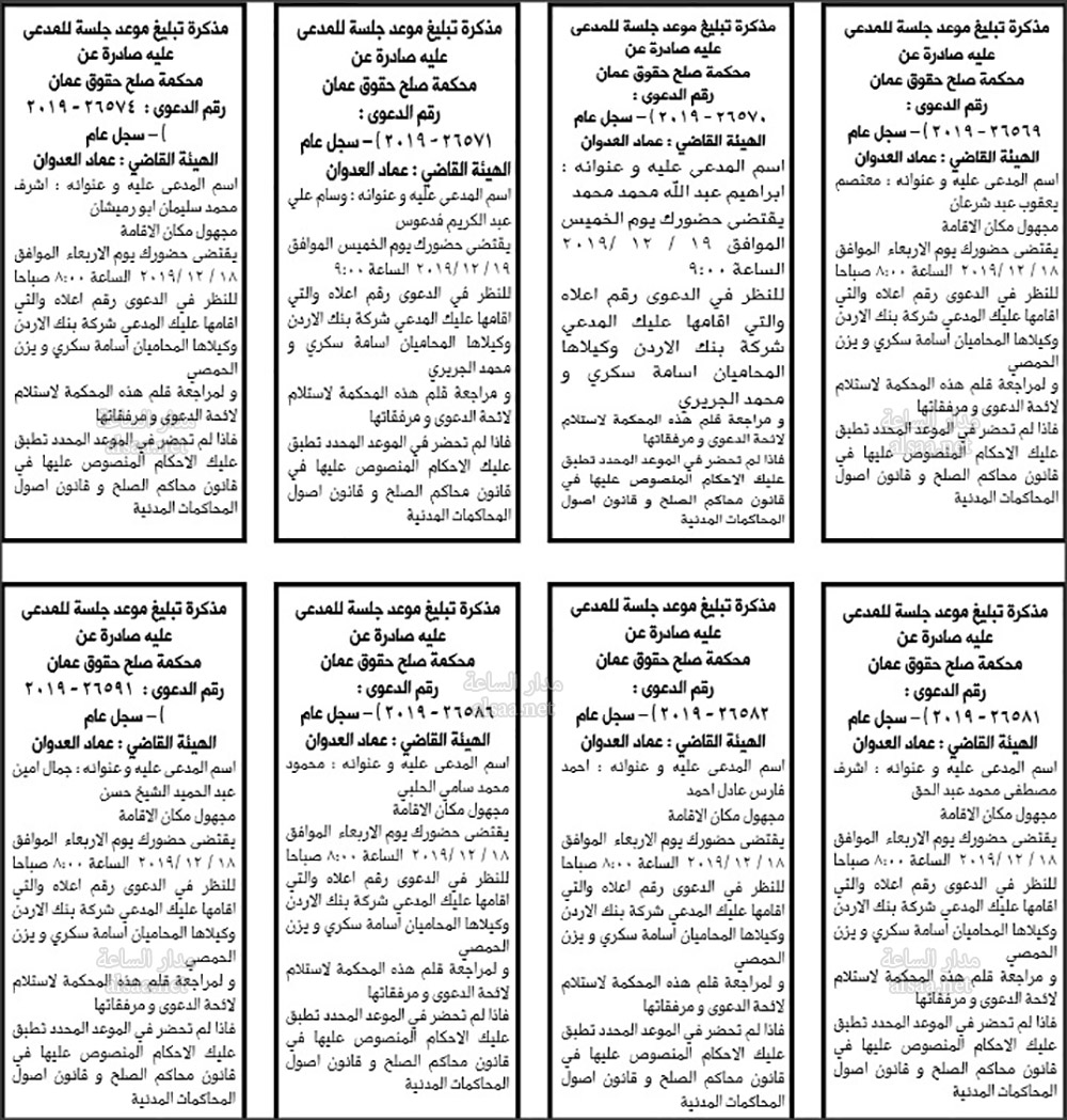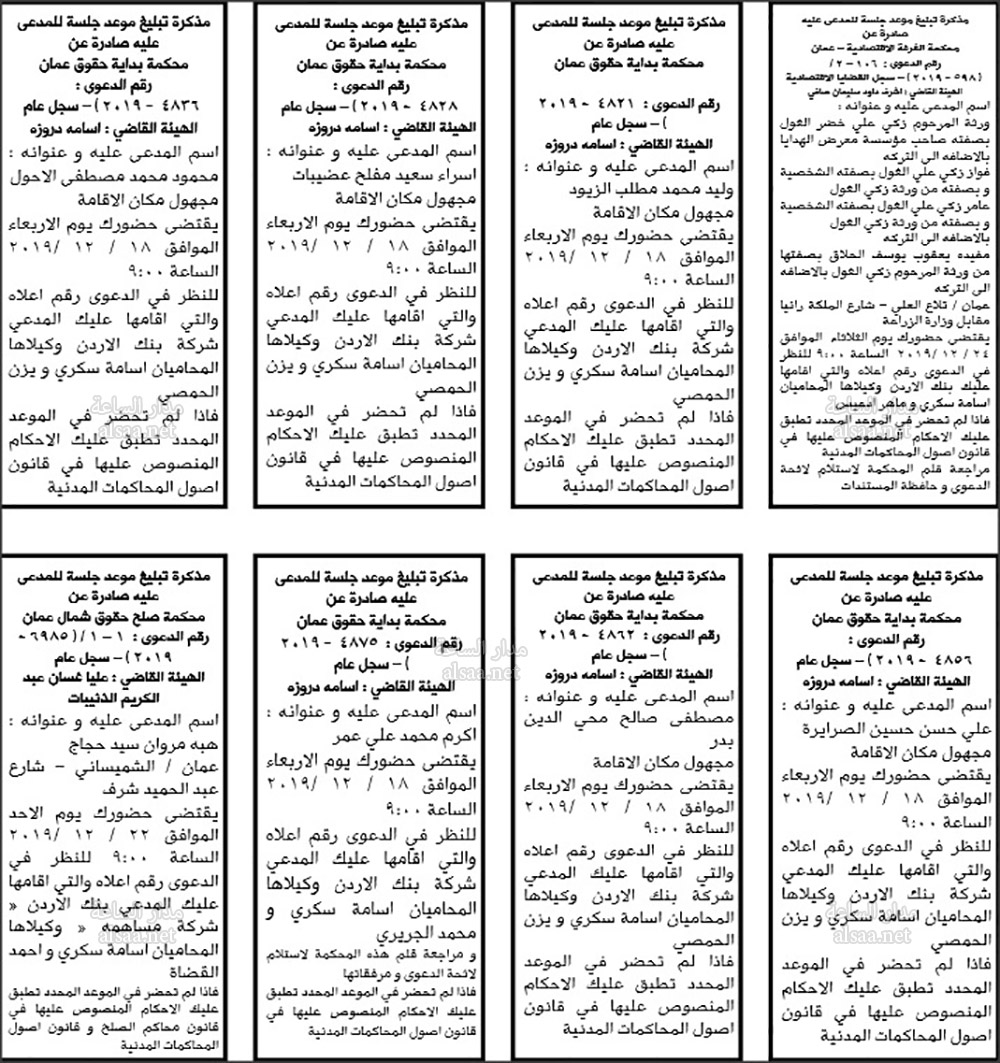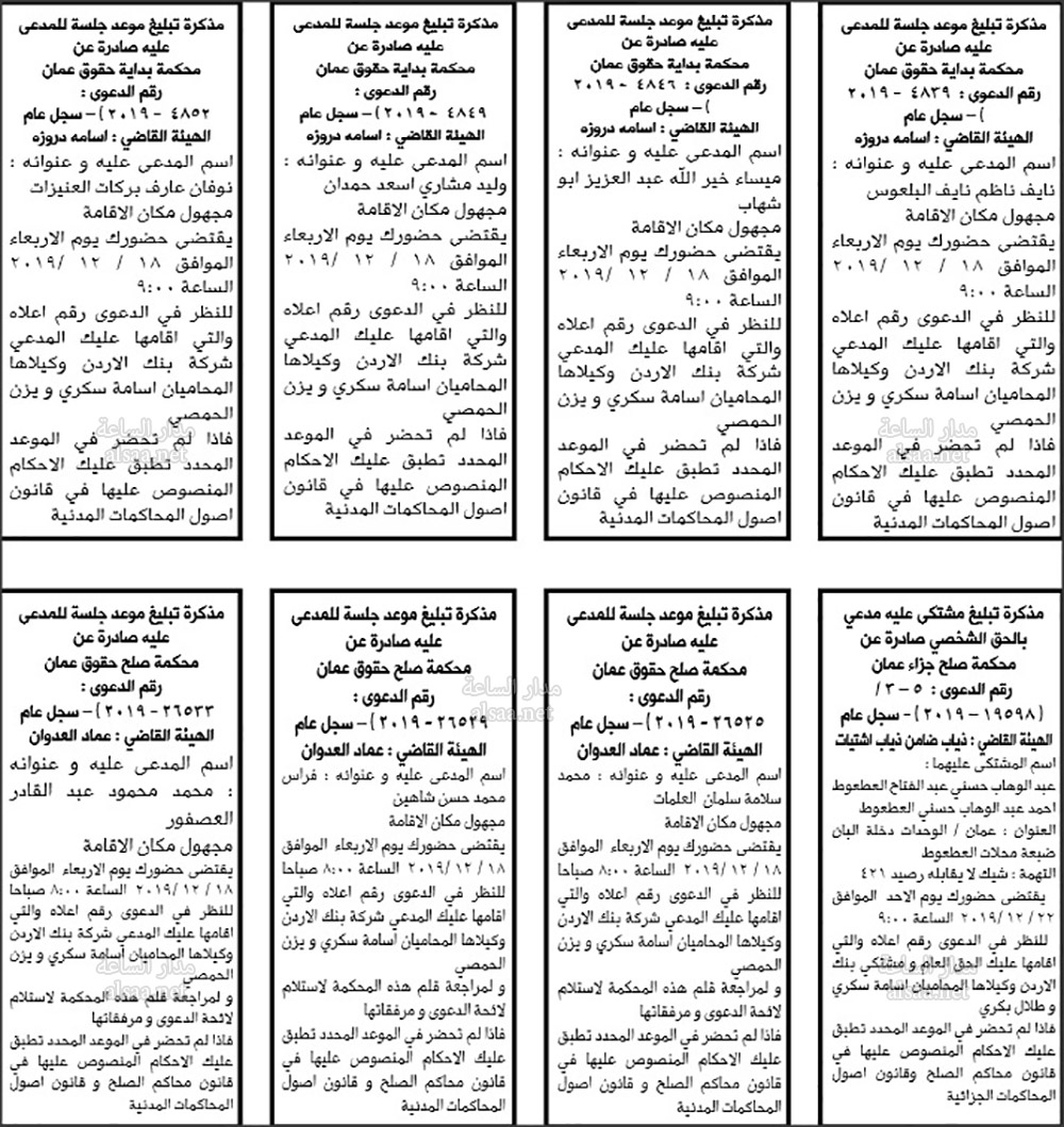 وكالة الناس – أعلنت محاكم اليوم الاحد 15/ 12 /2019.. عن مذكرات تبليغ مواعيد جلسات المحاكمة للمشتكى عليهم المذكورين في الجدول ادناه.