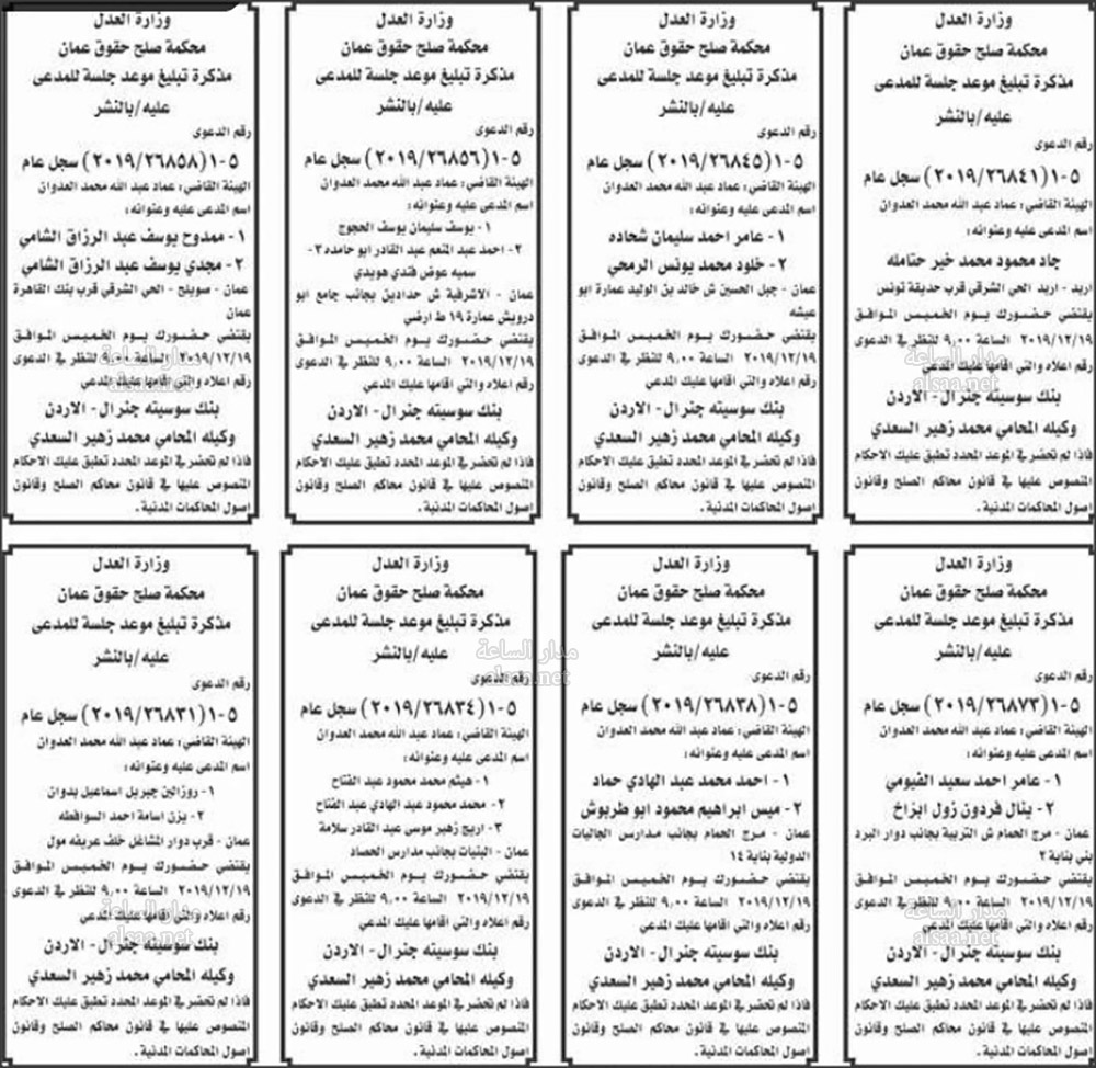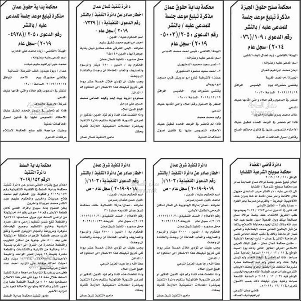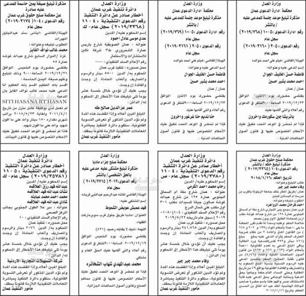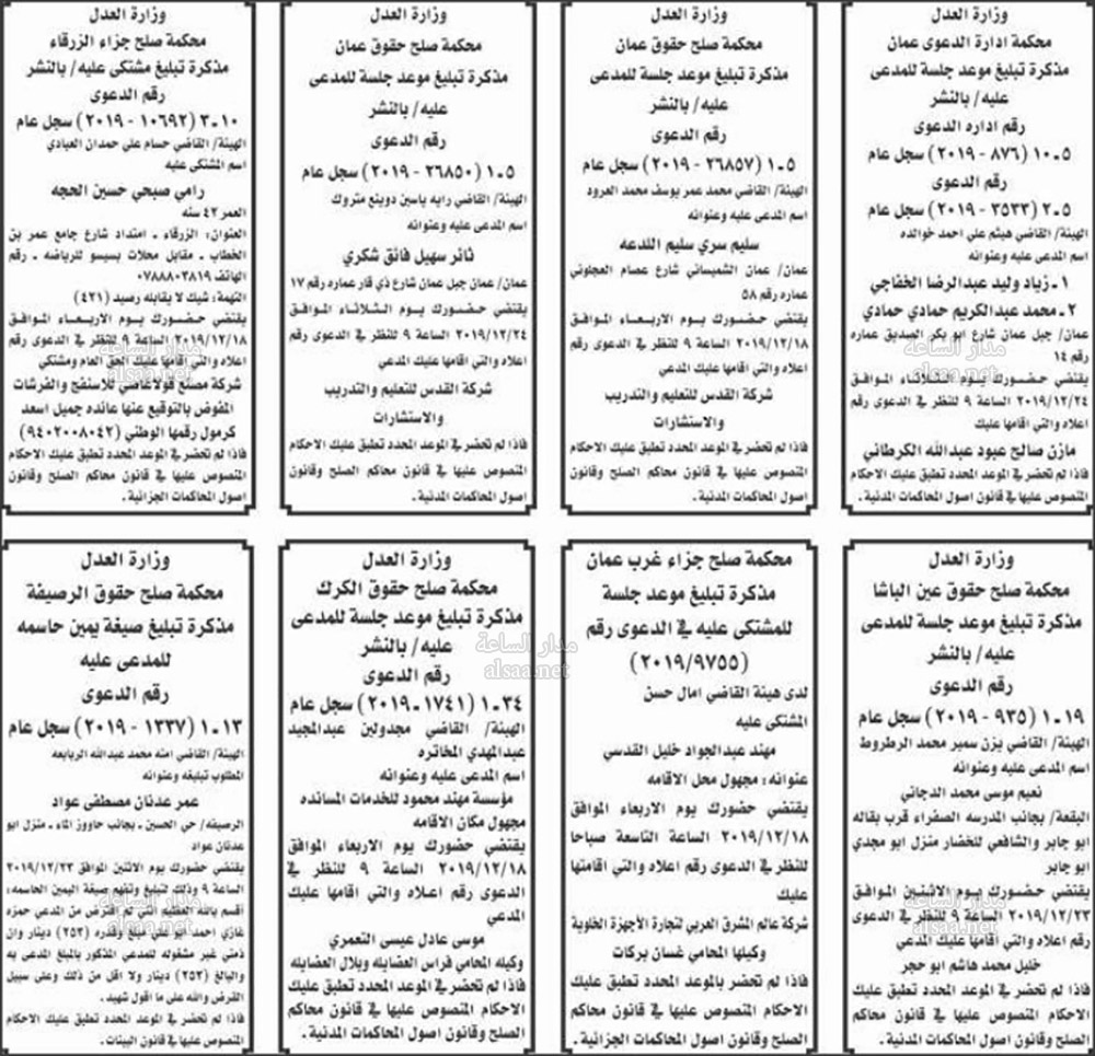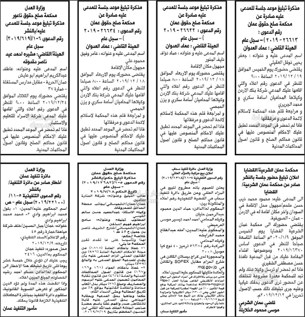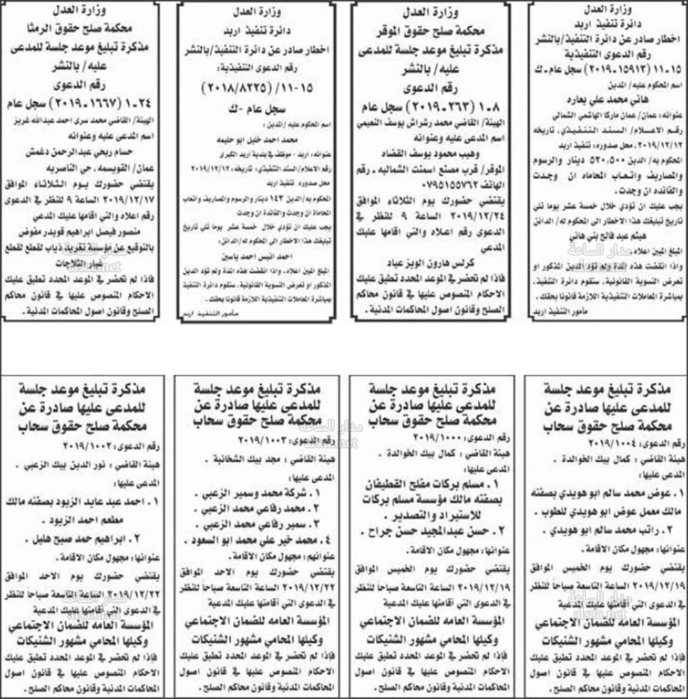 وكالة الناس – أعلنت محاكم اليوم الاحد 15/ 12 /2019.. عن مذكرات تبليغ مواعيد جلسات المحاكمة للمشتكى عليهم المذكورين في الجدول ادناه.