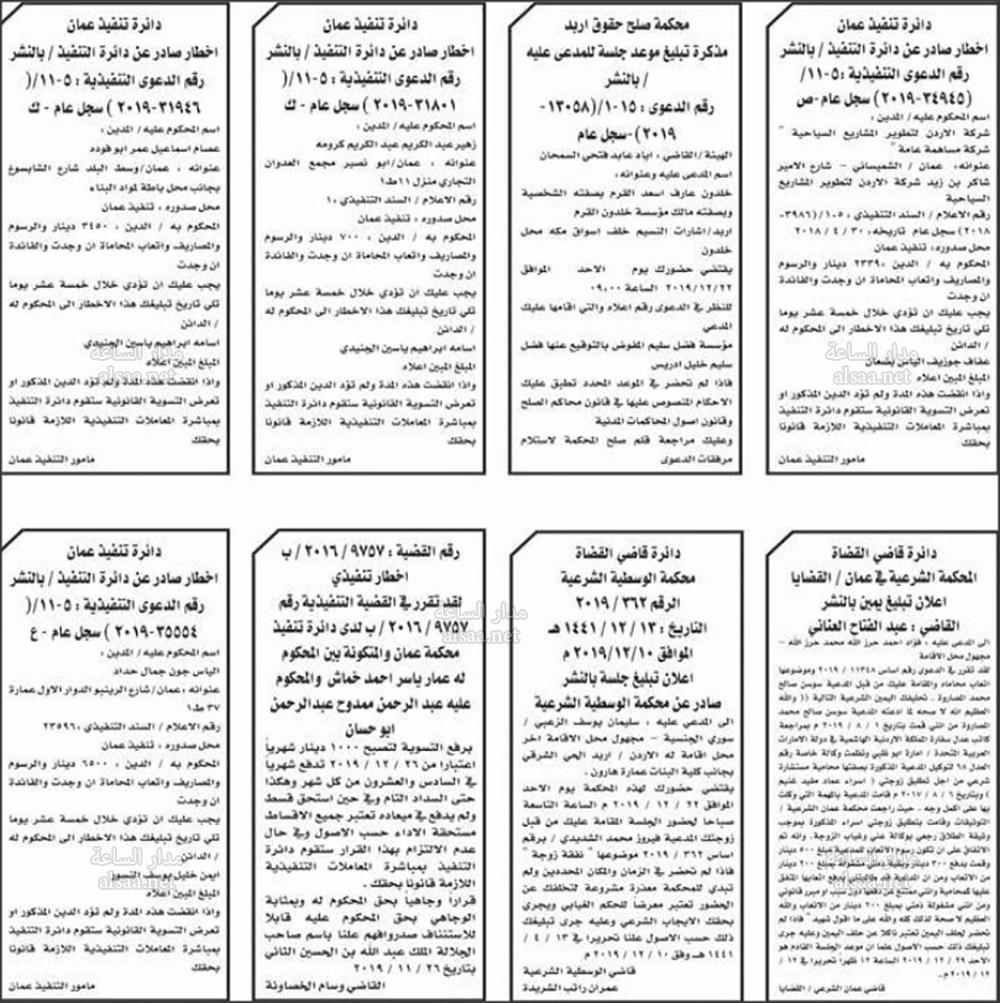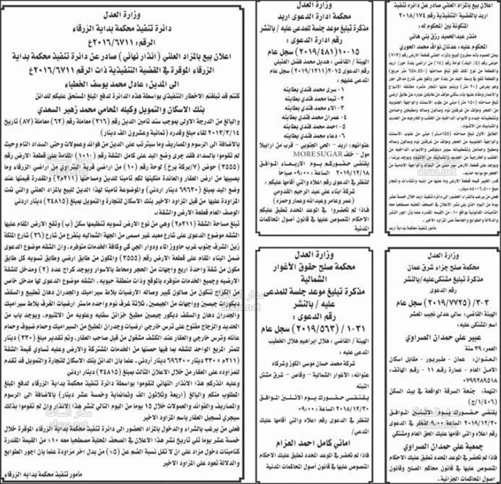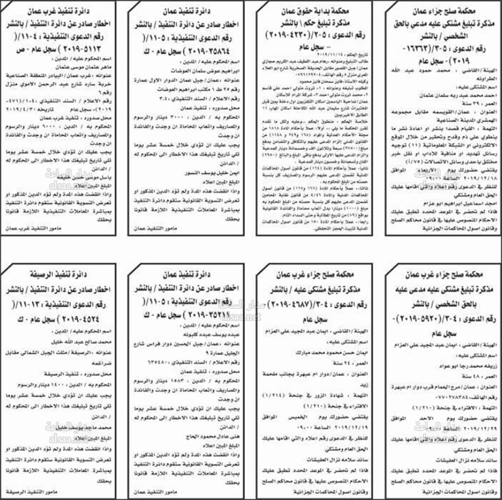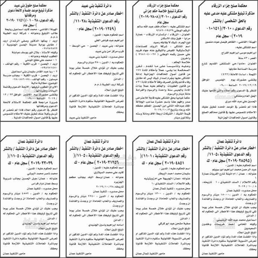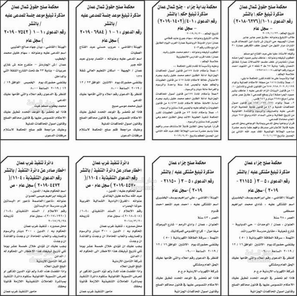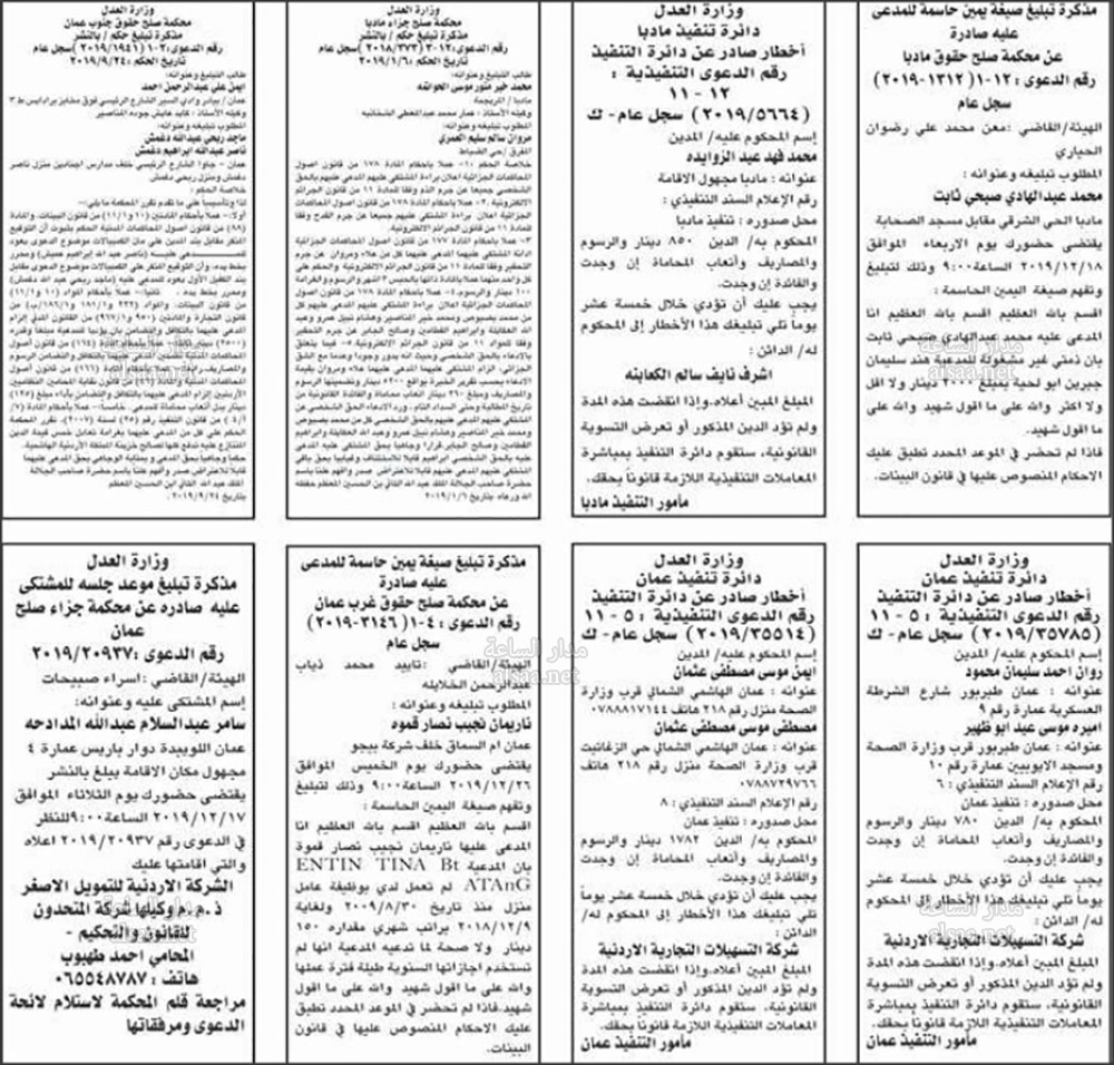 وكالة الناس – أعلنت محاكم اليوم الاحد 15/ 12 /2019.. عن مذكرات تبليغ مواعيد جلسات المحاكمة للمشتكى عليهم المذكورين في الجدول ادناه.