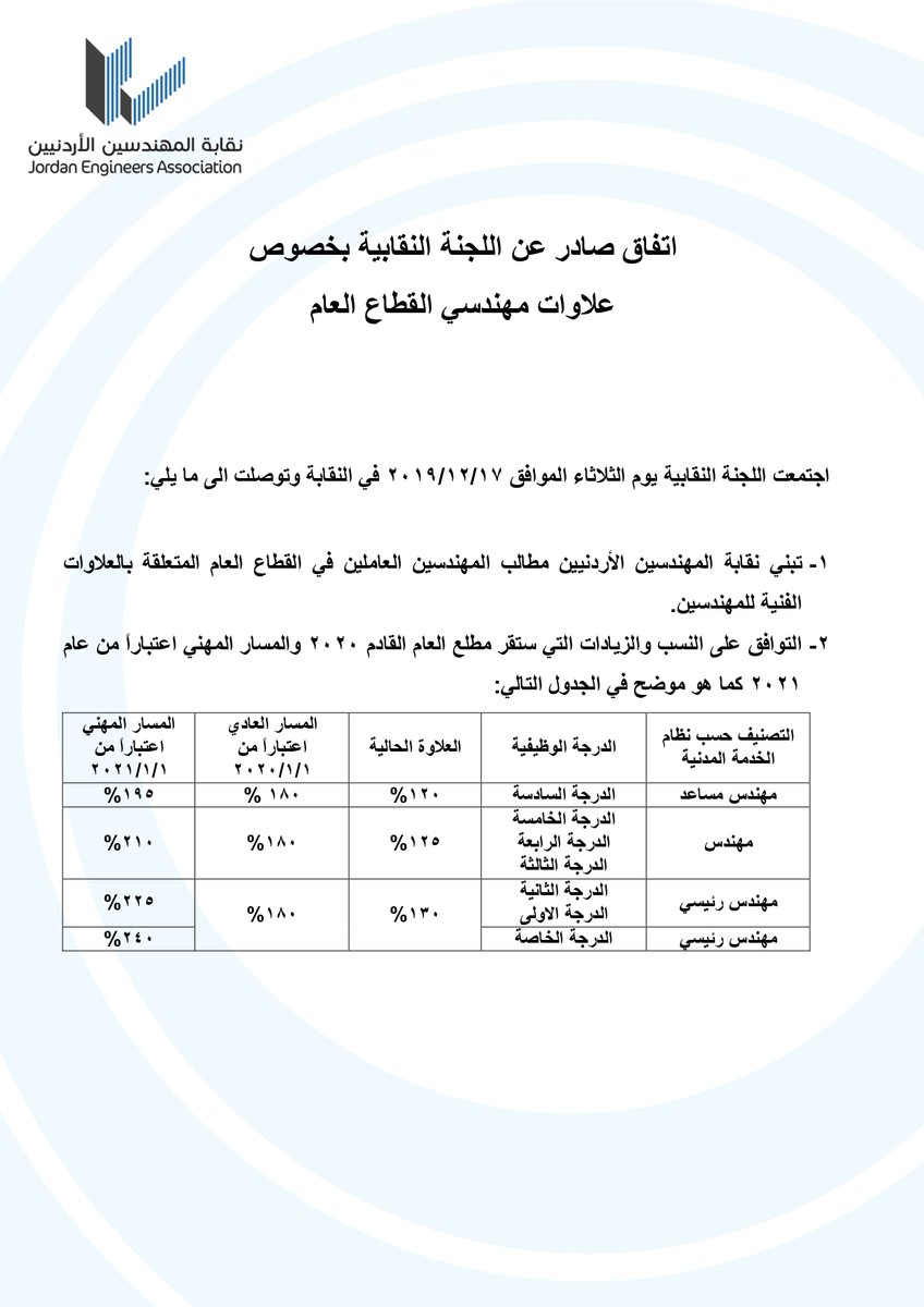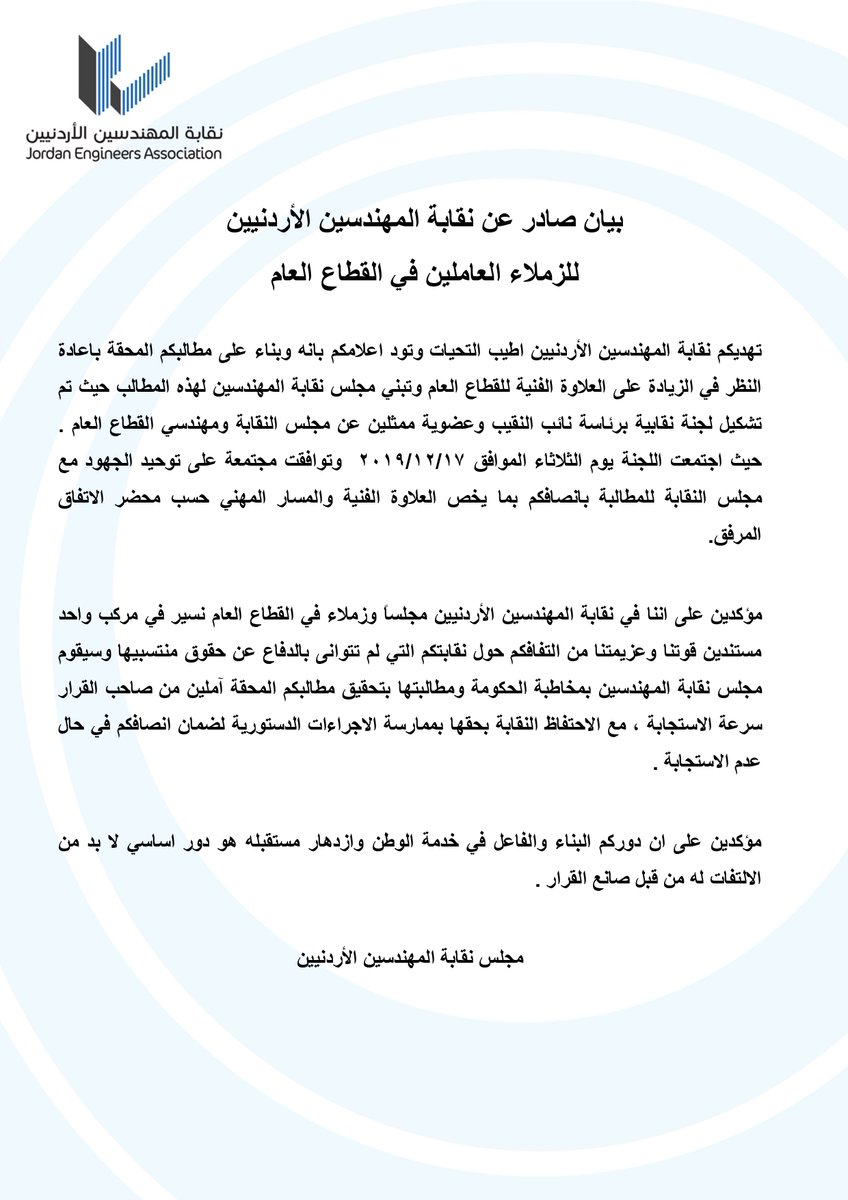 نقابة المهندسين الأردنيين تصدر بيان هام حول العلاوات Last updated ديسمبر 17, 2019 Share وكالة الناس – أصدرت نقابة المهندسين الأردنيين بياناً للزملاء العاملين في القطاع العام.