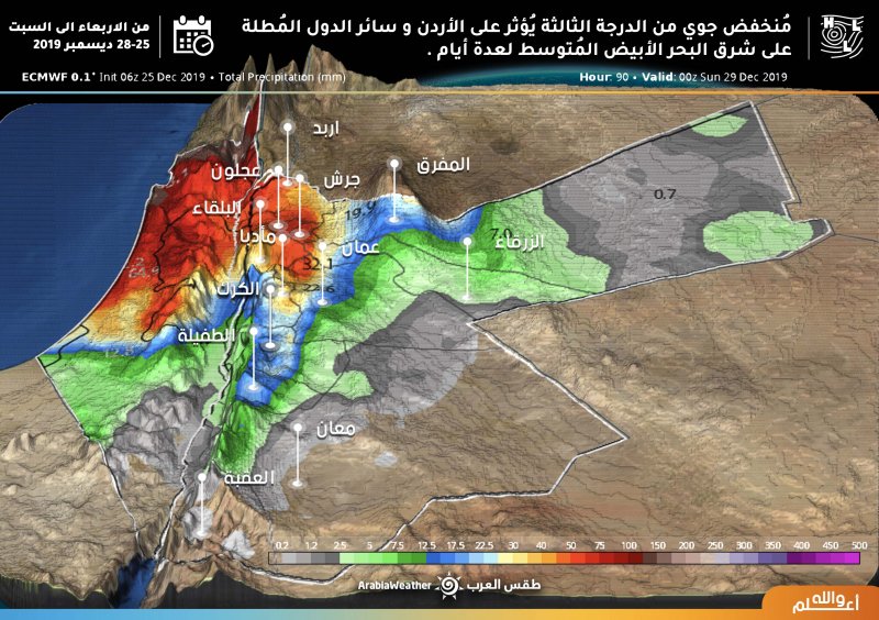 و يُتوقع أن تُسجل محافظات الشمال نهار الخميس كميات كبيرة من الأمطار قد تفوق حاجز الـ 75 مم مما يؤدي إلى تشكل السيول و جريان الاودية و ارتفاع منسوب المياه في بعض المناطق.