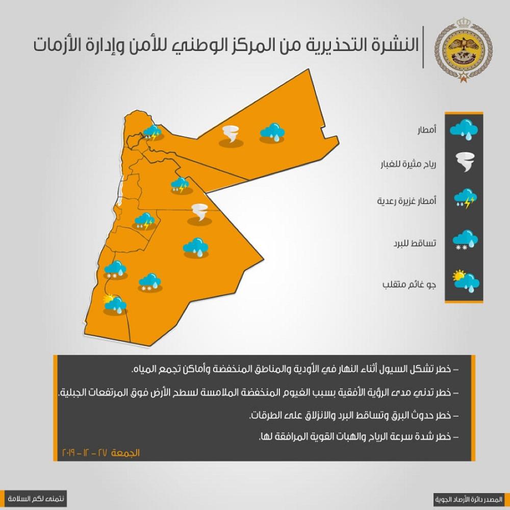 ونشر المركز الوطني للأمن وإدارة الأزمات، على صفحته الرسمية على موقع التواصل الاجتماعي فيسبوك, خارطة مخاطر الحالة الجوية لليوم الجمعة، وحذر المركز من البرق وتساقط البرد والانزلاقات، وشدة سرعة الرياح والهبات القوية المرافقة لها.