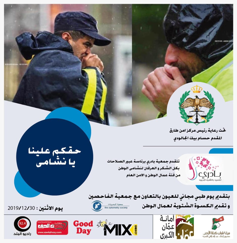 وكالة الناس – خالد ابو هزاع – اطلقت جمعية بادري للتنمية والتأهيل الخيريه مبادرة حقكم علينا يانشامى بالتعاون مع هيئة شباب كلنا الاردن انطلاقا من رؤية صاحب الجلالة الملك عبدالله الثاني ابن الحسين في خطابه الاخير الذى دعا فيه الكوادر الشبابيه للعمل والاصلاح في جميع مؤسسات الدوله الحكوميه تحت رعاية مدير المركز الامني لمنطقة طارق حسام الجالودي وحضور الشرطه المجتمعيه وقامات من وجهاء منطقه طبربور وكانت انطلاقة المبادره من امام امانة عمان الكبرى / منطقة طارق انطلاقا لجميع مناطق المملكه تزامنا مع المنخفضات الجويه في المملكه واكدت المهندسه جمانه البطاينه منسقة المبادره مع الجهات المختصه ان خدماتنا لكوادر الامن العام وعمال الوطن ستستمر طوال العام يدا بيد معهم ولخدمتهم فهؤلاء النشامى قاعده كبيره تخدم الوطن بأمانه وكما صرحت عبير الصلاحات رئيسة جمعية بادري ان هذه المبادره ماهي الا جزء صغير من حقهم علينا وشكر وعرفان لجهود هؤلاء الفرسان الذين لايملون من خدمة الشعب في الميدان كما قدمت جمعية بادري بهذا اليوم فحص طبي مجانا لكوادر الامن العام وموظفيين امانه عمان وعمال الوطن وقامت بتوزيع الكسوة والفطور والطواقي على عمال الوطن تقديرا منها لجهودهم في المنخفض الجوي الاخير .