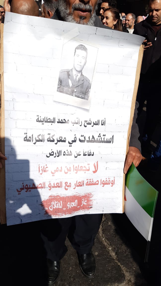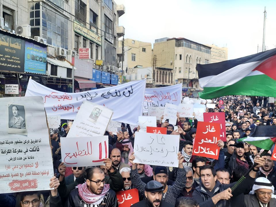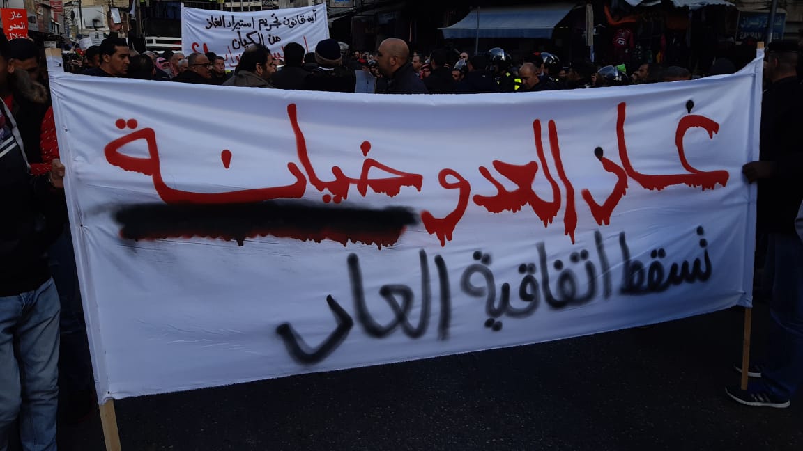 وهتف المحتجون: “اسمع اسمع يا رزاز تسقط اتفاقية الغاز ، ” أردن يا أرض الأحرار غاز العدو إلنا عار، “اضرب كفك اقدح نار غاز العدو استعمار، كما طالبوا بإسقاط اتفاقية وادي عربة وإغلاق السفارة الإسرائيلية في عمان، وقالوا: “علي الصوت من عمان لا سفارة للكيان ، “لا تطبيع ولا تركيع.