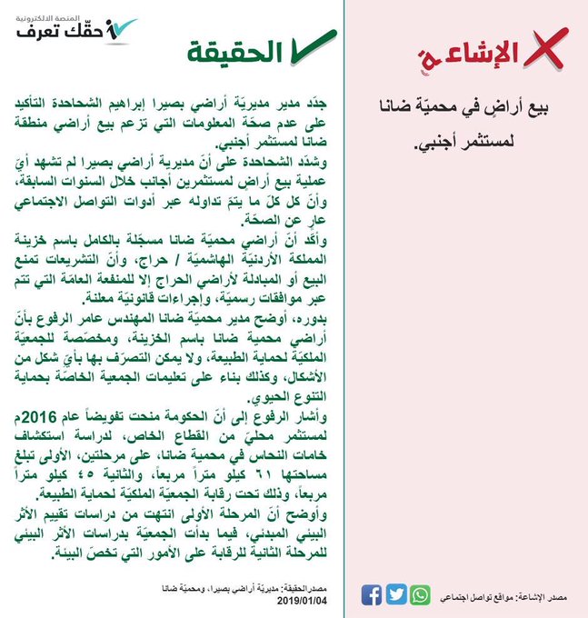 الحكومة تنفي بيع أراض في محمية ضانا لمستثمر أجنبي Last updated يناير 4, 2020 Share وكالة الناس – نفت الحكومة بيع أراض في محمية ضانا لمستثمر أجنبي
