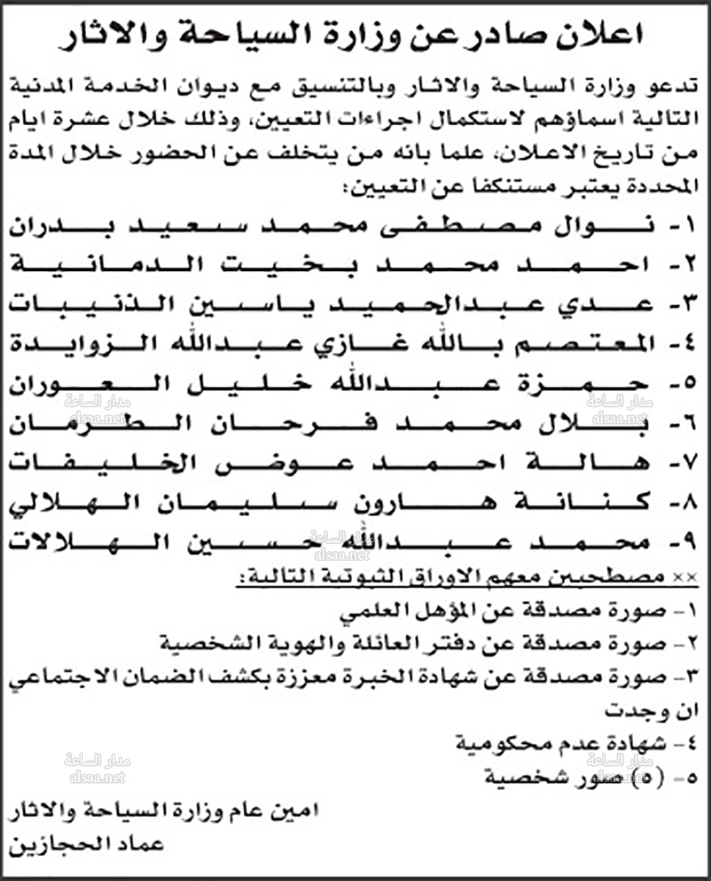 وكالة الناس – دعت وزارتا السياحة والاثار والتنمية الاجتماعية ودائرة قاضي القضاة اليوم الأحد وبالتنسيق مع ديوان الخدمة المدنية التالية اسماؤهم إلى المراجعة لاستكمال إجراءات التعيين.