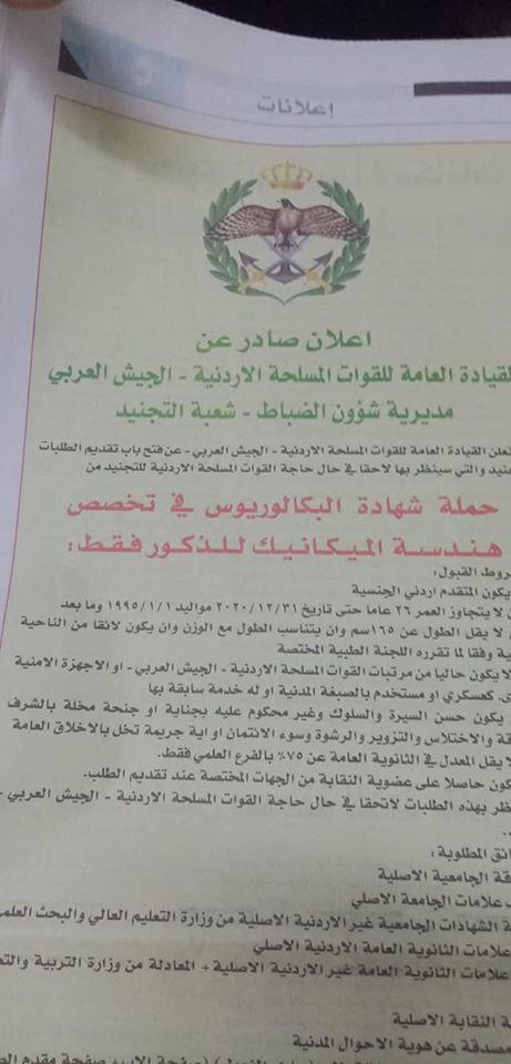 القوات المسلحة تفتح باب التجنيد لهذه التخصصات .. تفاصيل Last updated يناير 6, 2020 Share وكالة الناس – أعلنت القيادة العامة للقوات المسلحة الأردنية عن فتح باب التجنيد لبعض التخصصات وفق الشروط المطلوبة. وأعلن الجيش اليوم الإثنين عن حاجته لتجنيد أفراد من تخصص الطب البشري وطب الأسنان (ذكور وإناث) وهندسة ميكانيك (ذكور) فقط.
