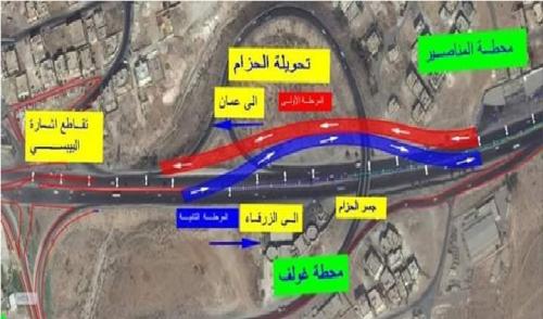 وبينت الوزارة انه بدأ صباح الجمعة تنفيذ المرحلة الأولى من تحويلات الباص السريع وفيها: تم تحويل السير القادم من الزرقاء باتجاه عمان الى: التحويلة الجديدة يمين جسر الحزام القائم ومن ثم الاتجاه الى الاشارة الضوئية ، مع ضرورة الالتزام باتجاه المسرب الأيمن للمتجهين الى عمان وسط البلد ، والالتزام بالمسرب الأيسر للمتجهين الى طريق الحزام عبر الاشارة الضوئية.