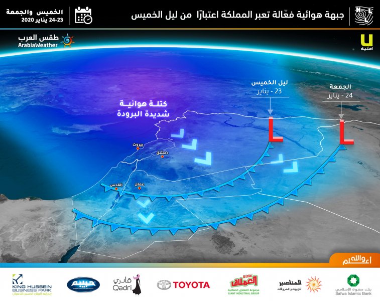 ويبدأ تأثير المنخفض الجوي “سريع الفعالية” في المناطق الشمالية للمملكة اعتبارًا من مساء وليل الخميس/الجمعة، سرعان ما يمتد لمناطق وسط المملكة، ولاحقا مع ساعات الليل المتأخرة وصباح الجمعة لباقي مناطق المملكة، ثلوج متوقعة على المرتفعات العالية الجنوبية، ويتوقع تساقط الثلج وتراكمها فوق جبال الجنوب العالية، خاصة في الطفيلة والشوبك.