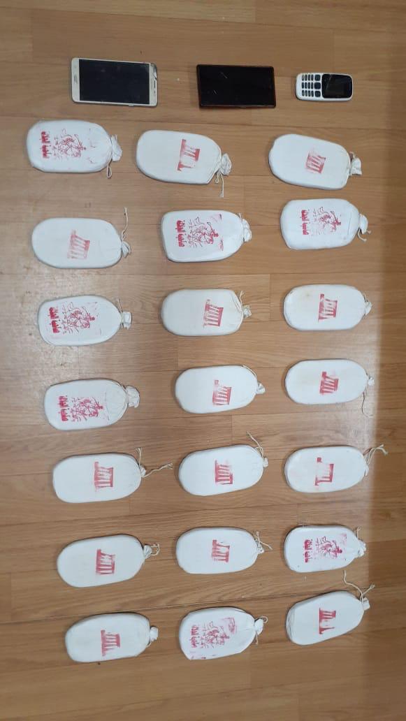 وفي إحدى مناطق البادية الوسطى جرت متابعة شخصين داخل مركبة بعد ورود معلومات حول حيازتهما لكمية كبيرة من المواد المخدرة وبعد ايقافها وإلقاء القبض على الشخصين بداخلها ضُبط بحوزتهما على ٢٠ كفاً من مادة الحشيش المخدرة.