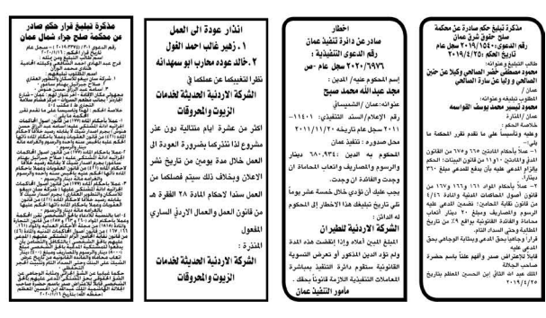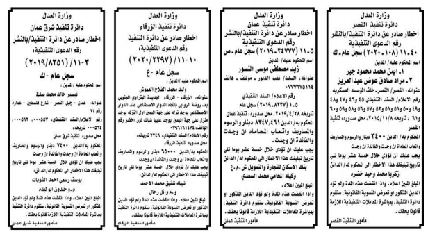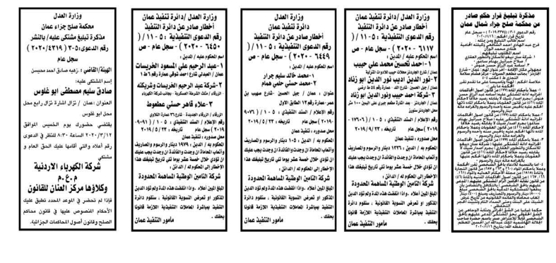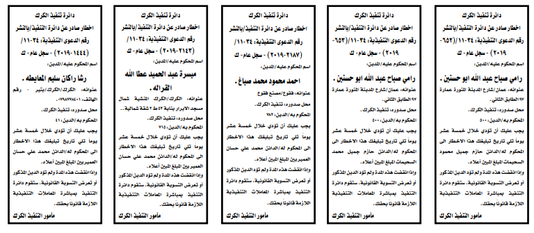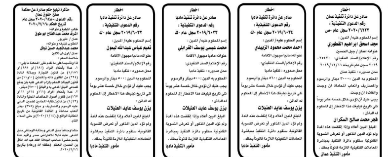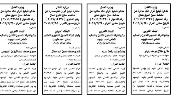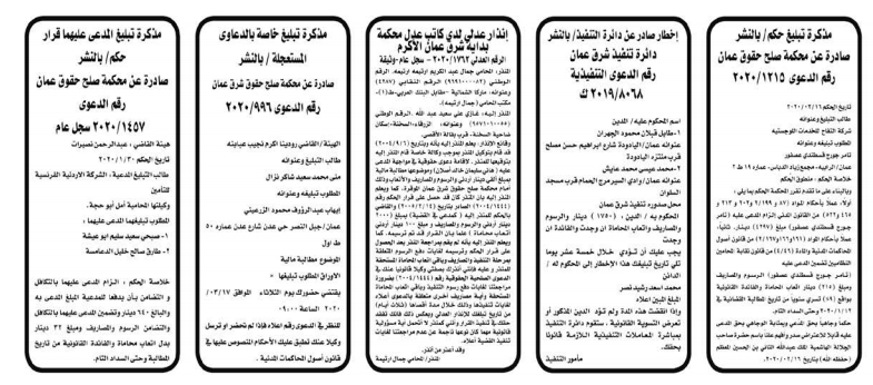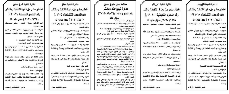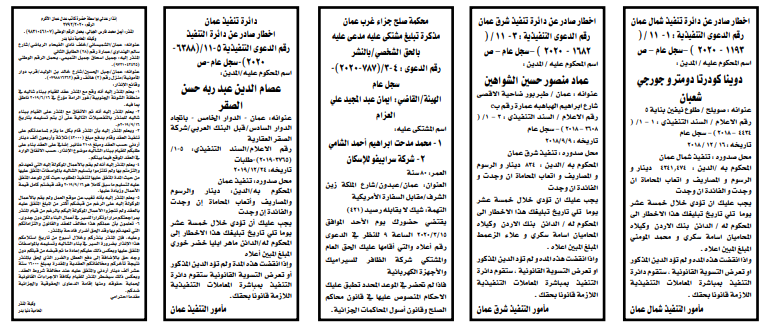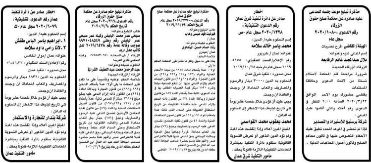 وتضمنت مذكرات الطلب التي تنشرها سرايا بعض الاحكام الصادرة غيابياً إضافة إلى إخطارات وإشعارات صادرة عن دوائر التنفيذ بحق مدعى عليهم أشخاص كانوا أم شركات.