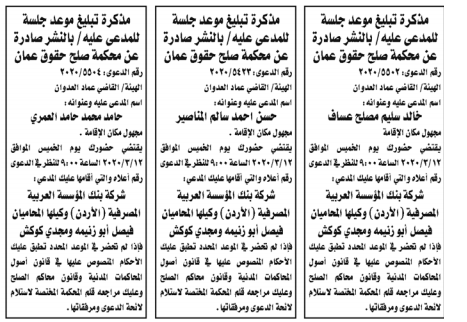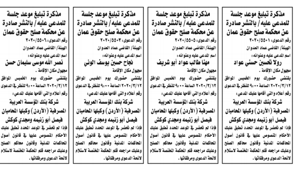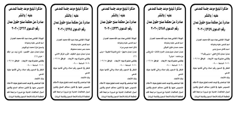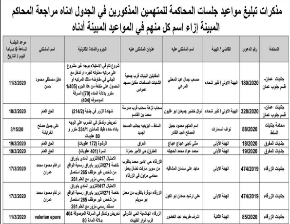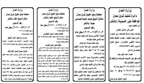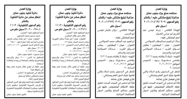 وكالة الناس – أعلنت وزارة العدل اليوم الثلاثاء عن مذكرات تبليغ مواعيد جلسات المحاكمة للمدعى عليهم بقضايا مختلفة عن طريق المحاكم.