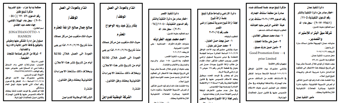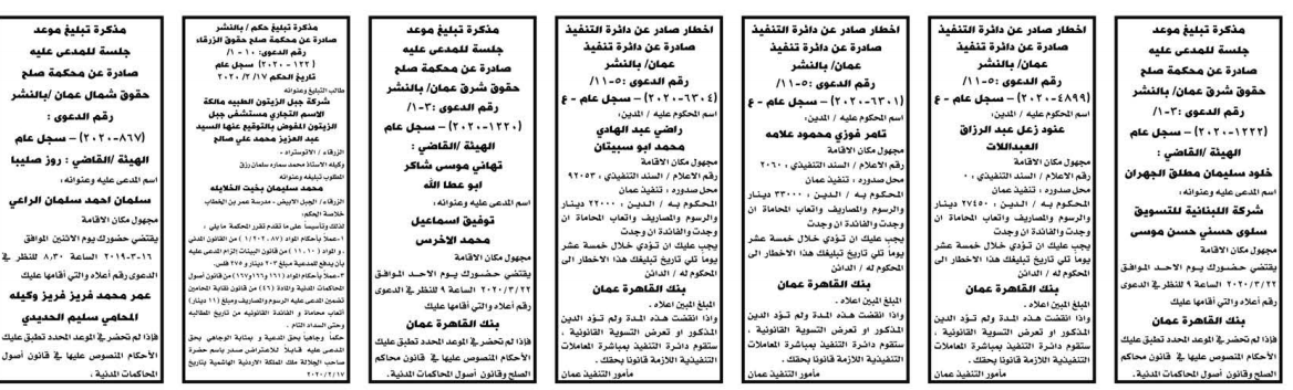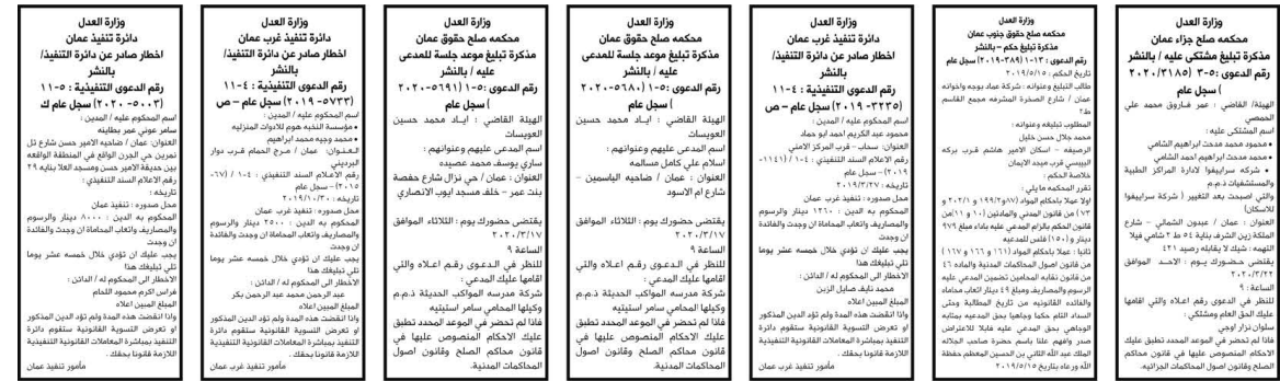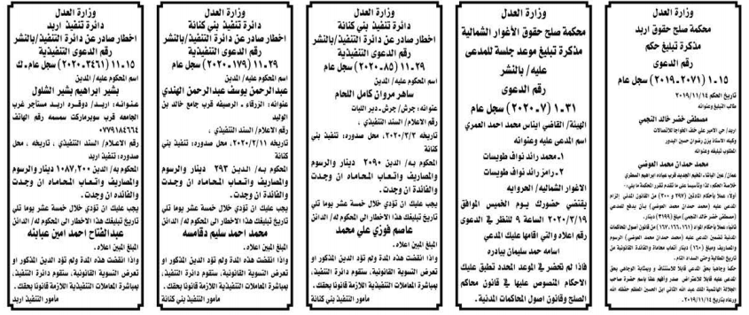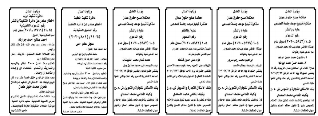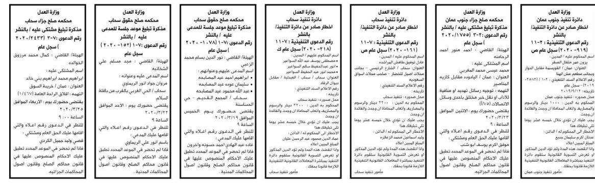 وكالة الناس – أعلنت وزارة العدل اليوم الثلاثاء عن مذكرات تبليغ مواعيد جلسات المحاكمة للمدعى عليهم بقضايا مختلفة عن طريق المحاكم.