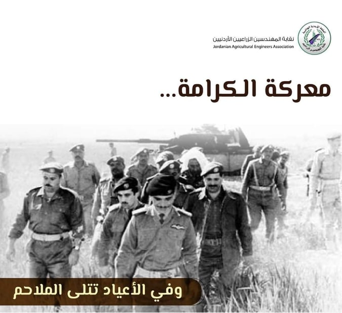 اليوم وفي الذكرى الثانية والخمسين لنصر جيشنا الاردني في معركة الكرامة، يخوض جيشنا ومعه جميع الاردنيون وعلى رأسهم القيادة الهاشمية معركة أخرى ضد الوباء العالمي فيروس كورونا. اليوم بمغزل الصبر والضبط ينسج جيشنا الاردني بمنتسبيه وافراده وضباطه راية نصر اخرى على عدونا المستجد، وينشر على ذرى أردننا شماغ العز، ويحوطه بزنده إلى قلبه، ليكون هذا الوطن وأبناؤه نبضه و دقاته.