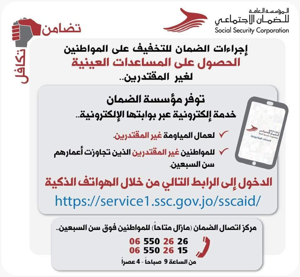 إجراءات الضمان الاجتماعي للحصول على المعونات Last updated مارس 25, 2020 Share وكالة الناس – نشرت مؤسسة الضمان الاجتماعي إجراءات خدمة الحصول على المعونات العينية لمن تجاوزوا سن السبعين و عمال المياومة على النحو التالي: عزيزي المواطن يرجى استخدام هاتفك المحمول أو التابلت ويرجى العلم بأنه سيتم التنسيق مع السجل الوطني الموحد لدى صندوق المعونة الوطني للتحقق من مدى الاستحقاق