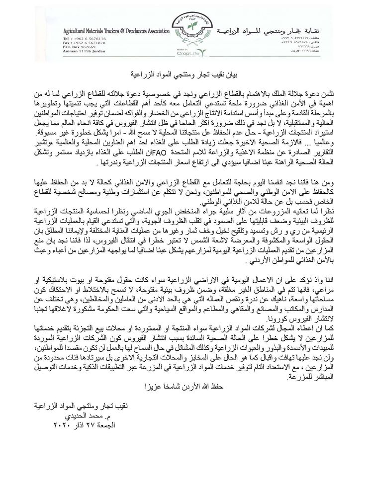 وكالة الناس – حذر نقيب تجار ومنتجي المواد الزراعية من الآثار السلبية من عدم رش ومكافحة الامراض الفطرية والحشرية خصوصا بعد العاصفة الجوية الماضية وطالب باعطاء التصاريح اللازمة للمهندسين الزراعيين في شركات المواد الزراعية الموردة للمبيدات والأسمدة والبذور ومستلزمات الانتاج المختلفة حتى يقوموا بدورهم من خلال التوصيل المباشر للمزرعة.