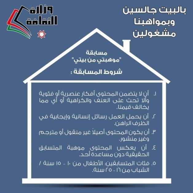 وكالة الناس – أعلن وزير الثقافة الدكتور باسم الطويسي إطلاق مسابقة موهبتي من بيتي التي تهدف إلى ملء أوقات الفراغ خلال فترة حظر التجوّل، واكتشاف المواهب وتحفيزها.